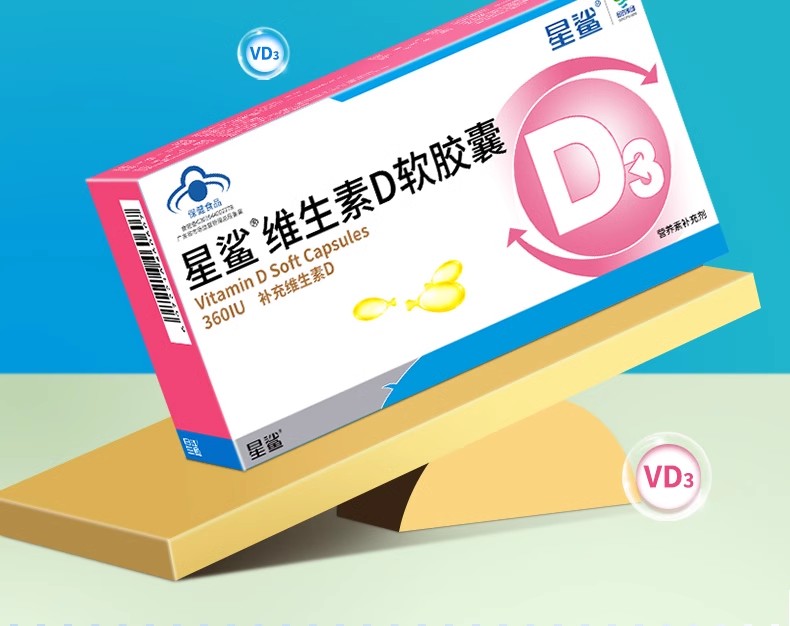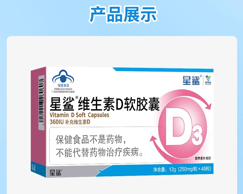 商品名称:星鲨维生素D软胶囊360IU 48粒/盒(下单1:1赠维D 10粒装)