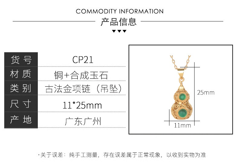 商品名称:彤彤兔 国风设计名族风铜古法金镶嵌合成玉石葫芦项链