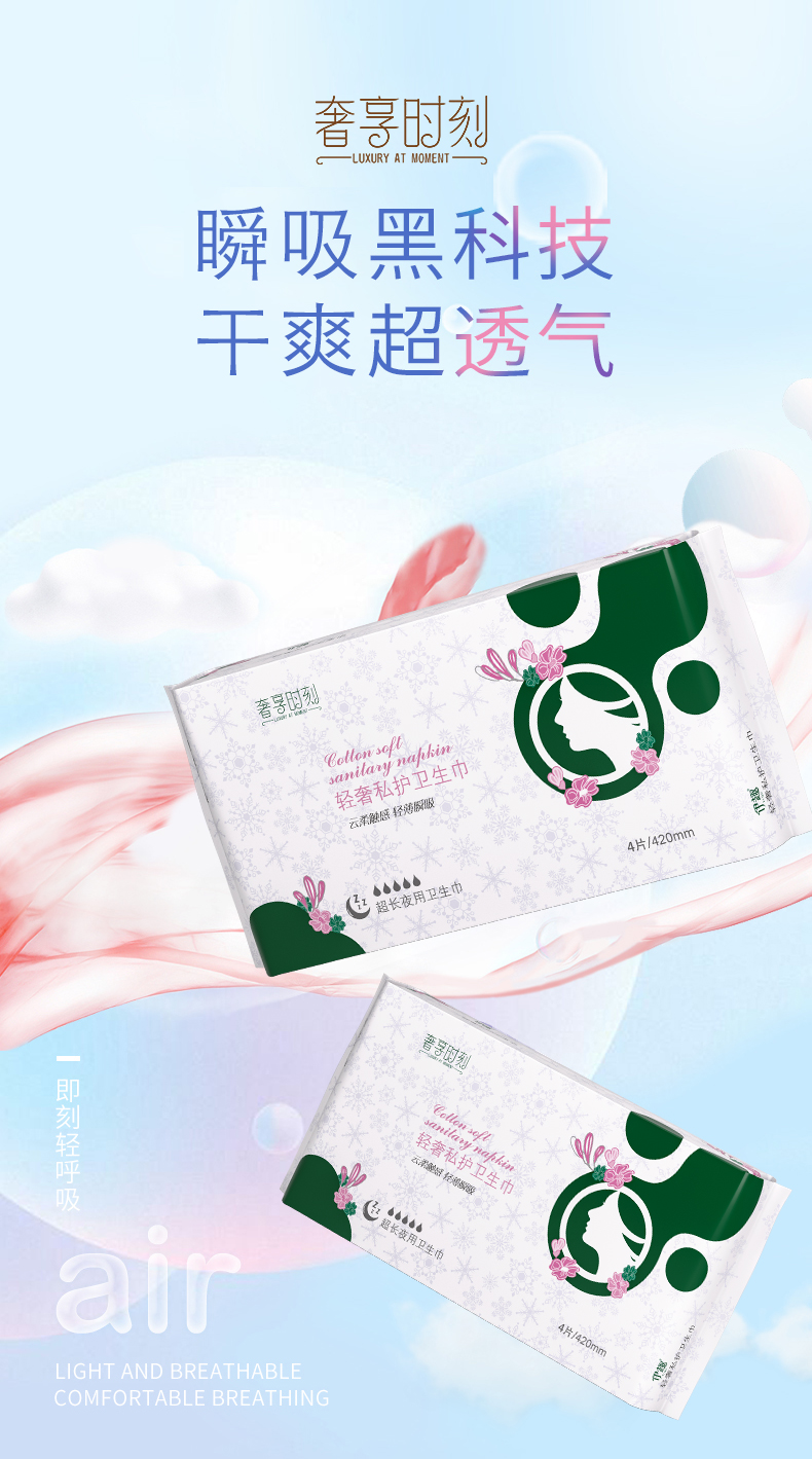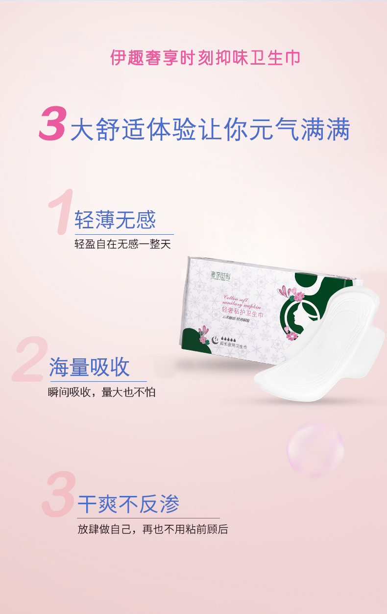 商品名称:【3包送试用装】伊趣云窝窝奢享棉柔超薄瞬吸卫生巾薰衣草祛味姨妈巾超长夜用4片420mm