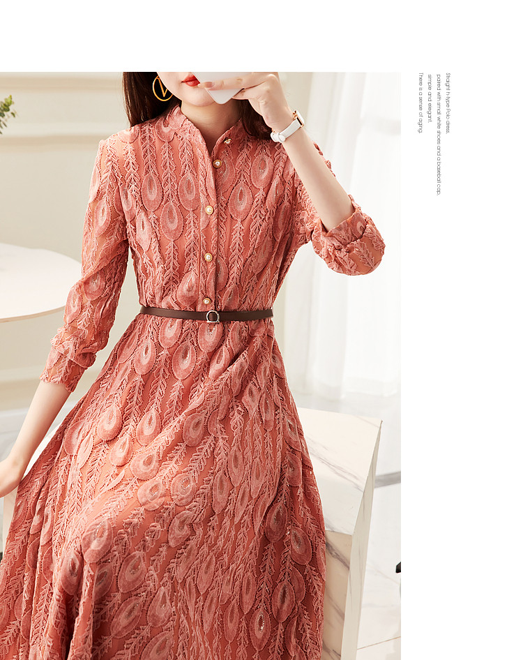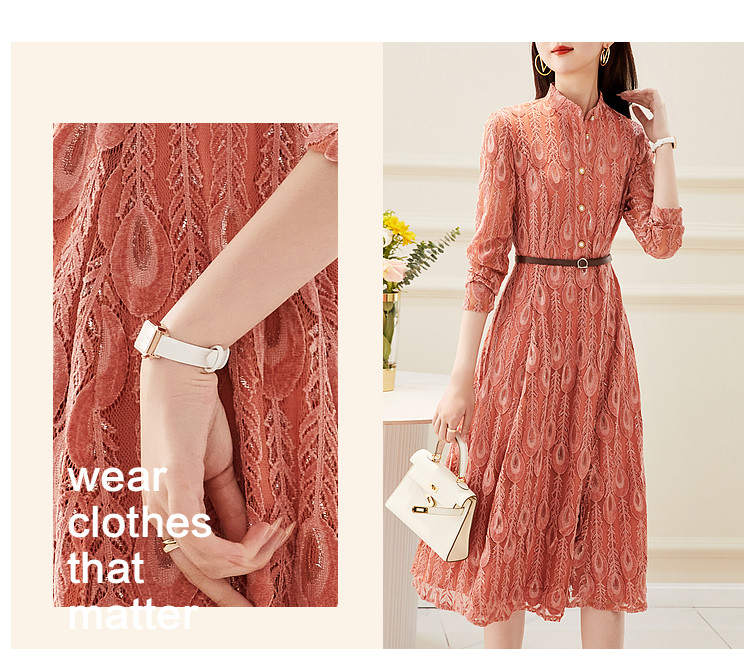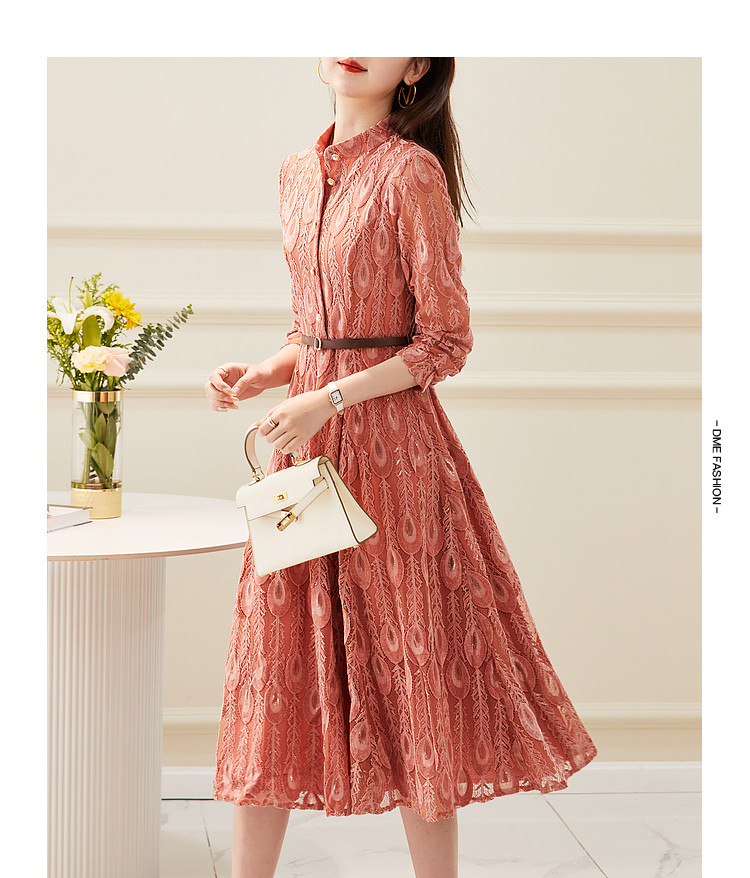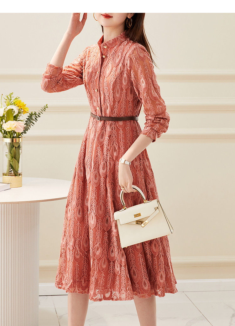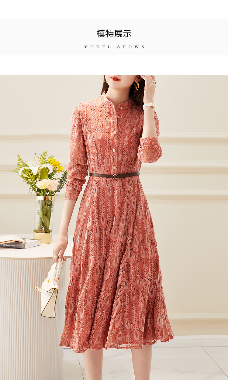 【羽毛蕾丝】春秋小立领长袖a摆连衣裙女 757313