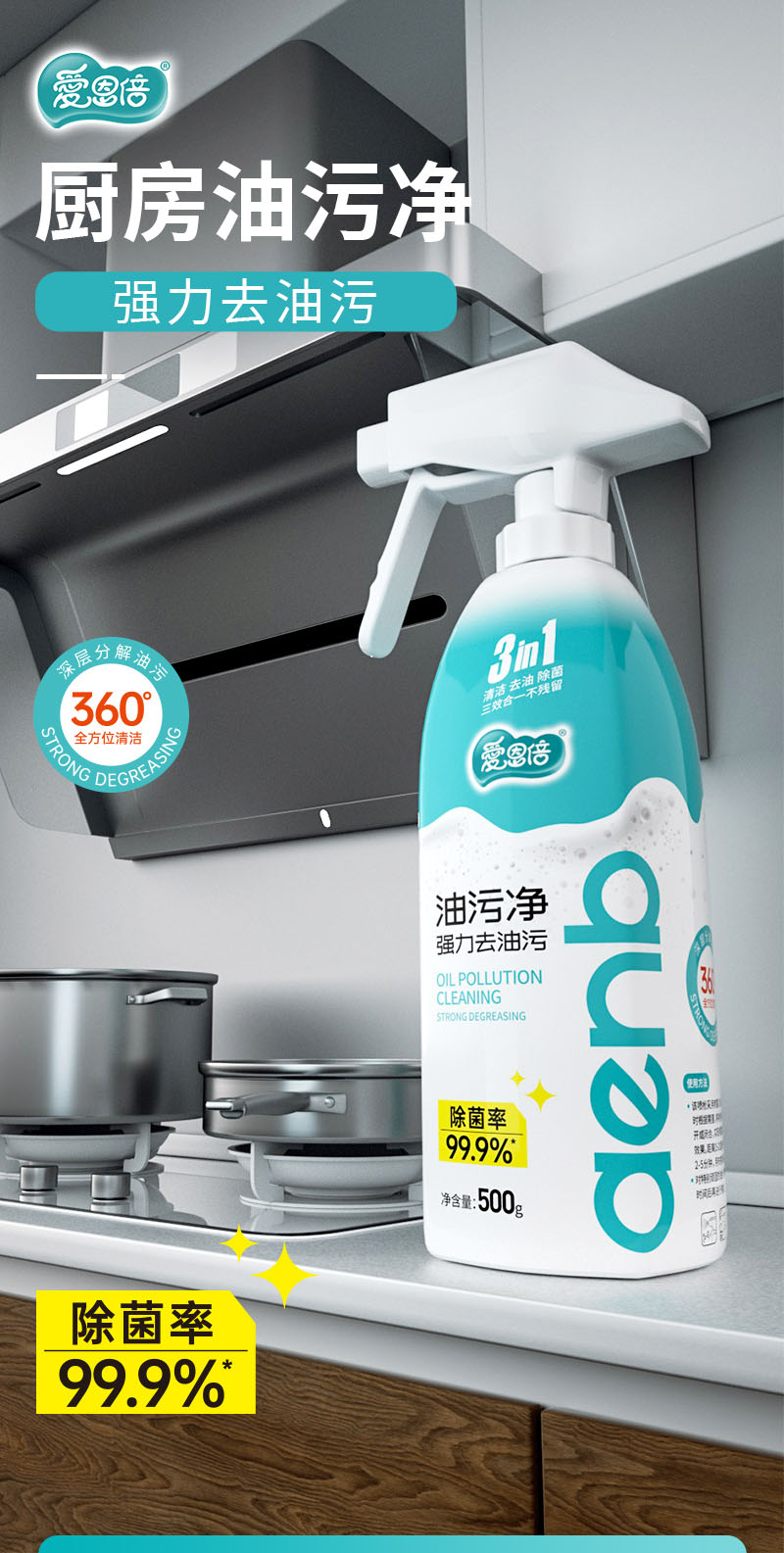 爱恩倍厨房油污净清洁剂家用油烟机清洁强力去污油烟净500ml