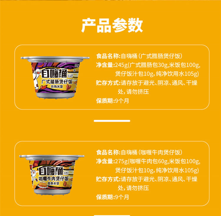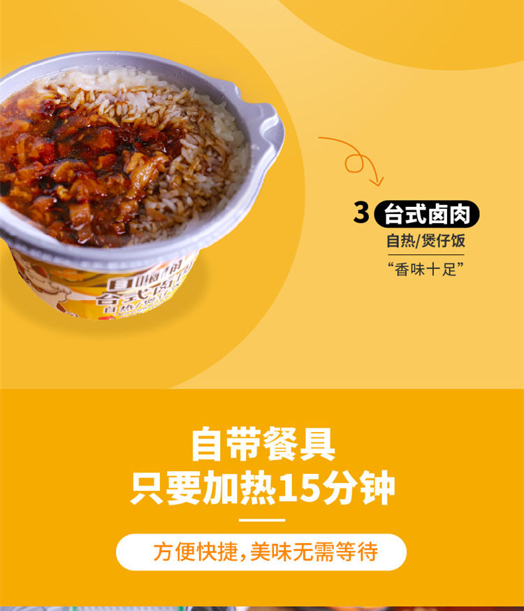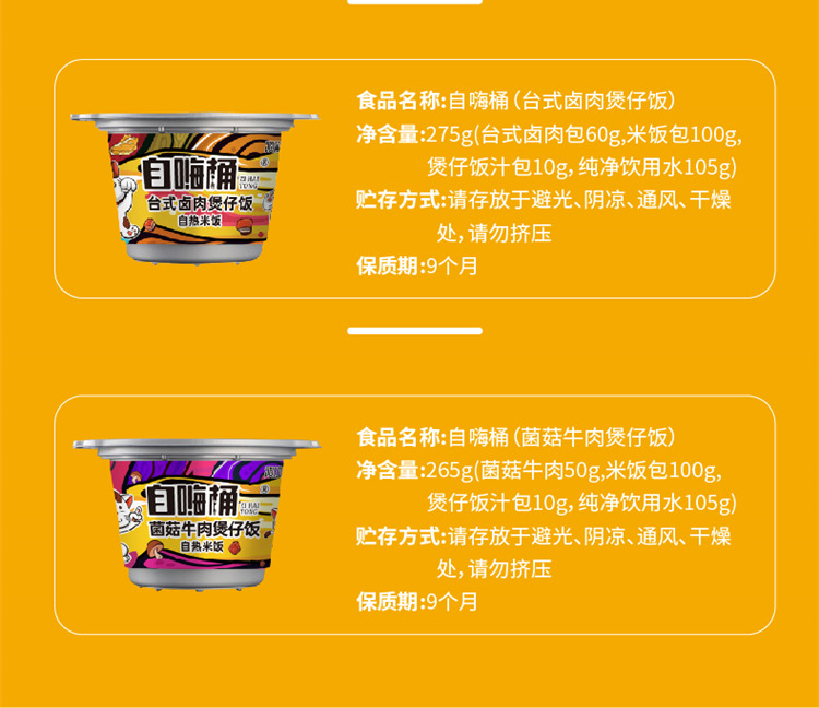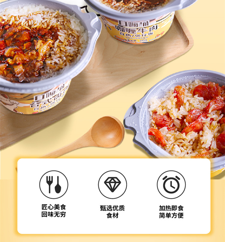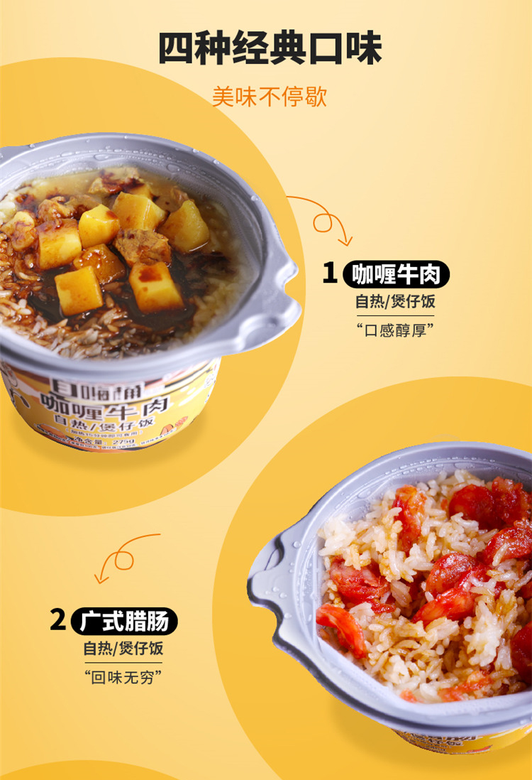 商品名称:谈小爱 自嗨桶自热米饭 4种口味混装 咖喱牛肉275g 菌菇牛肉265g 台式卤肉275g 广式腊肠245g