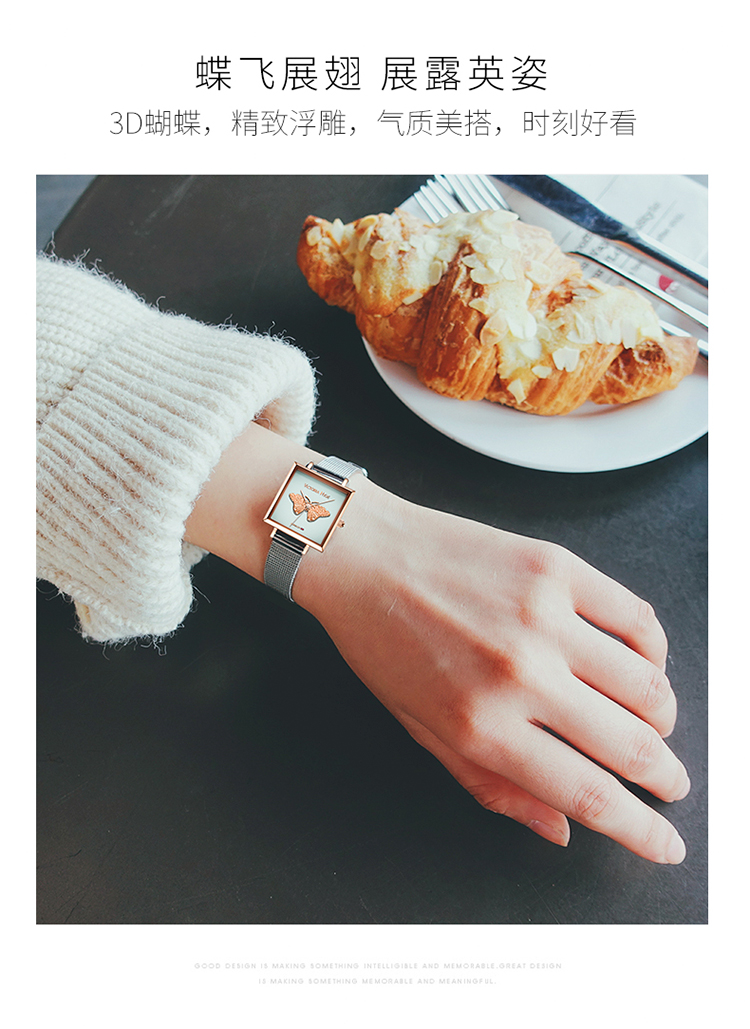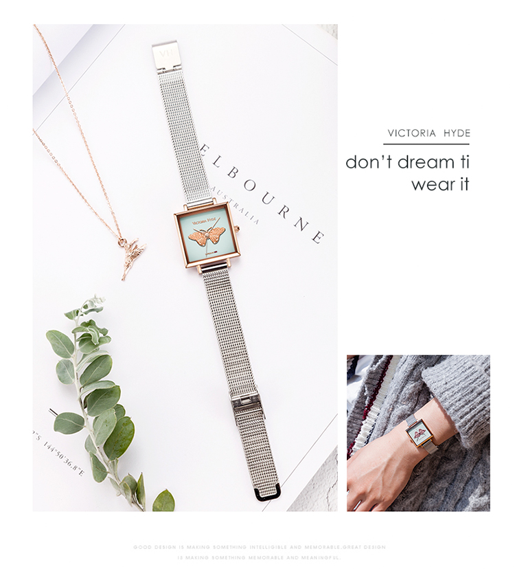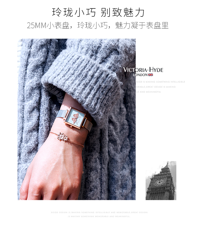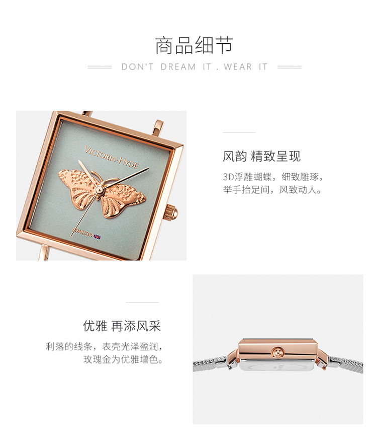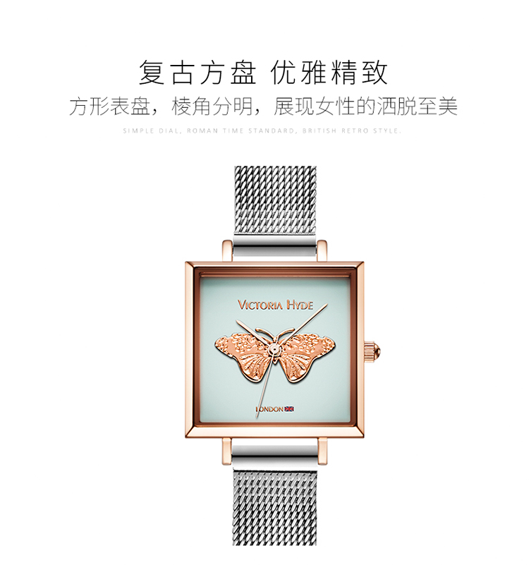 Victoria.Hyde/维多利亚海德 复古方表系列女士石英腕表3D浮雕蝴蝶结钢带款手表25mm