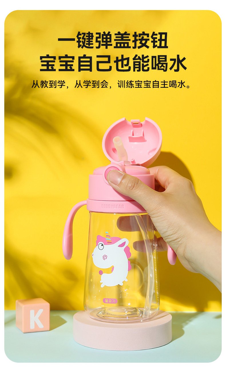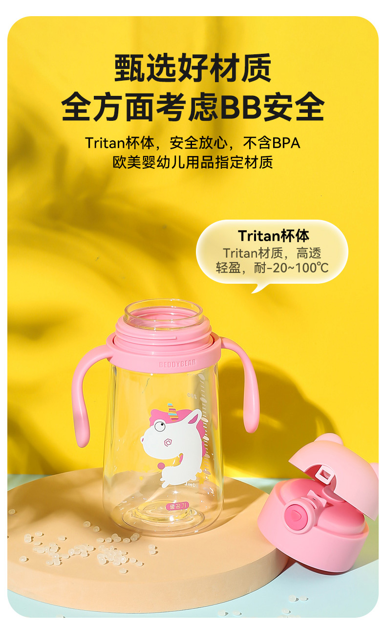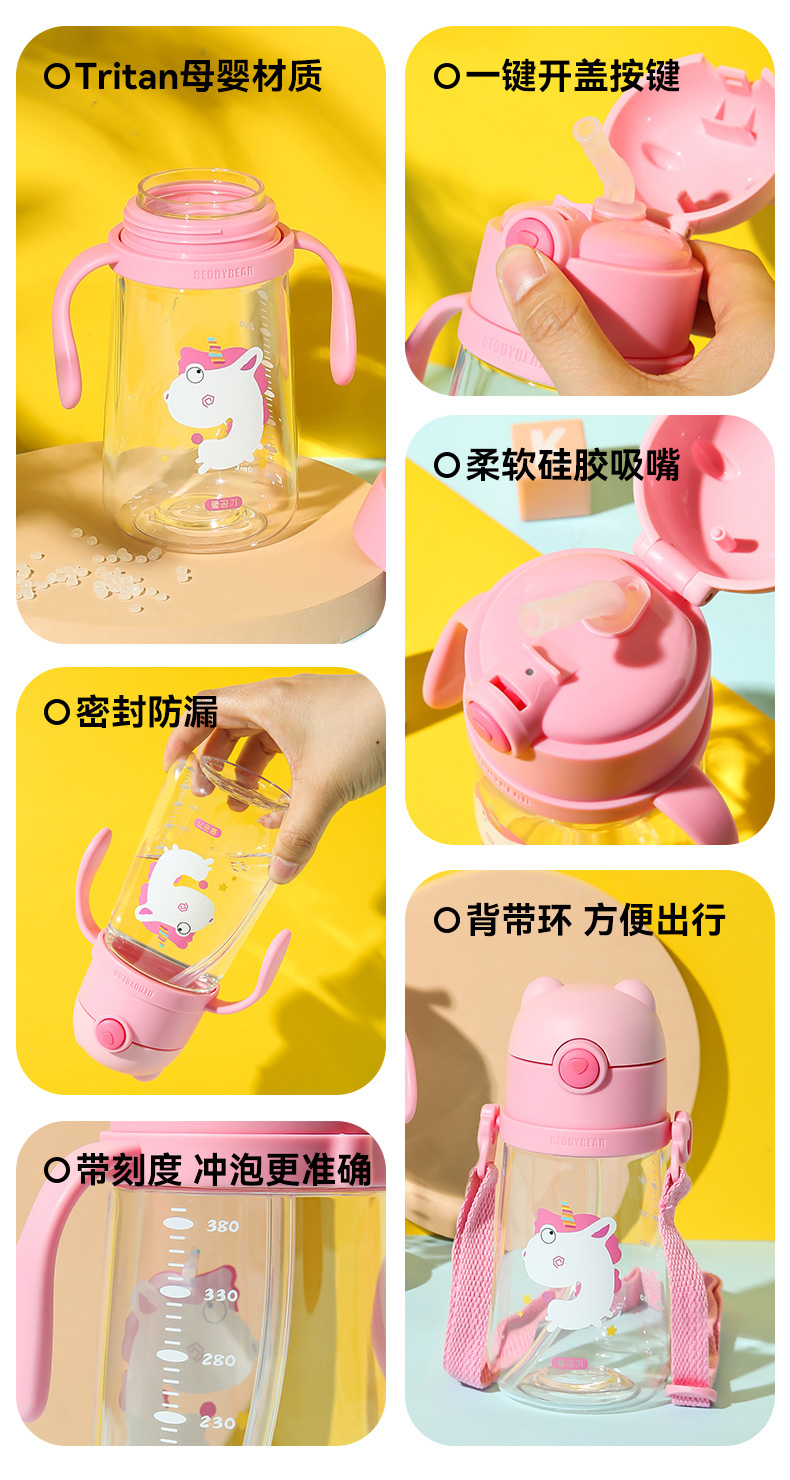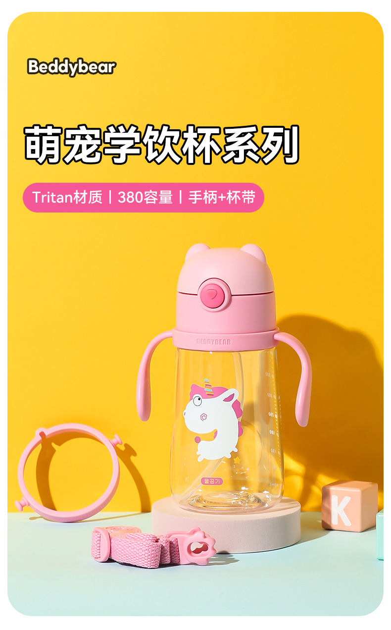 【品牌秒杀】杯具熊夏季水杯一杯两用杯绳+把手直吸吸管杯水杯婴幼儿水杯tritan 380ml