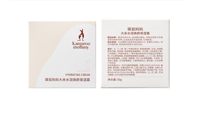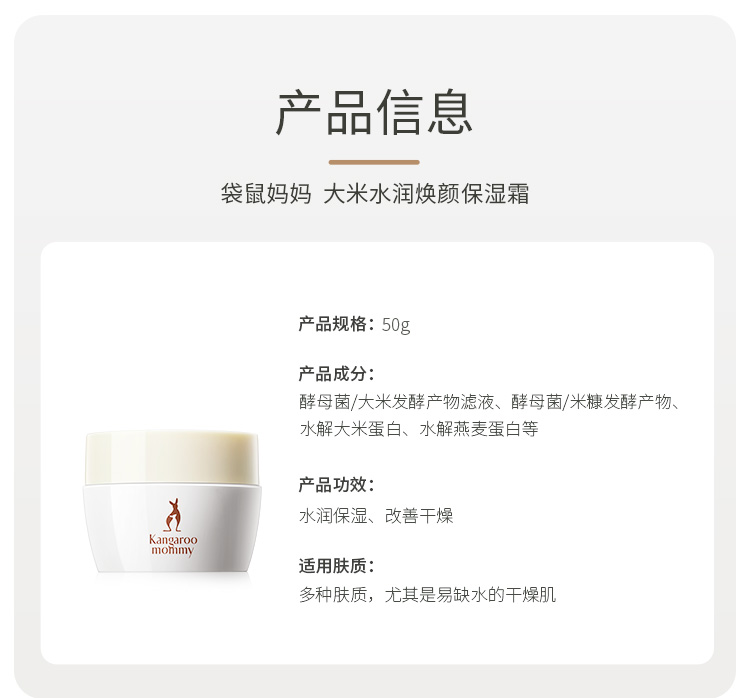 商品名称:袋鼠妈妈大米嫩肤保湿霜准孕妇可用护肤品滋润补水紧致清爽护肤锁水轻龄保湿面霜50g