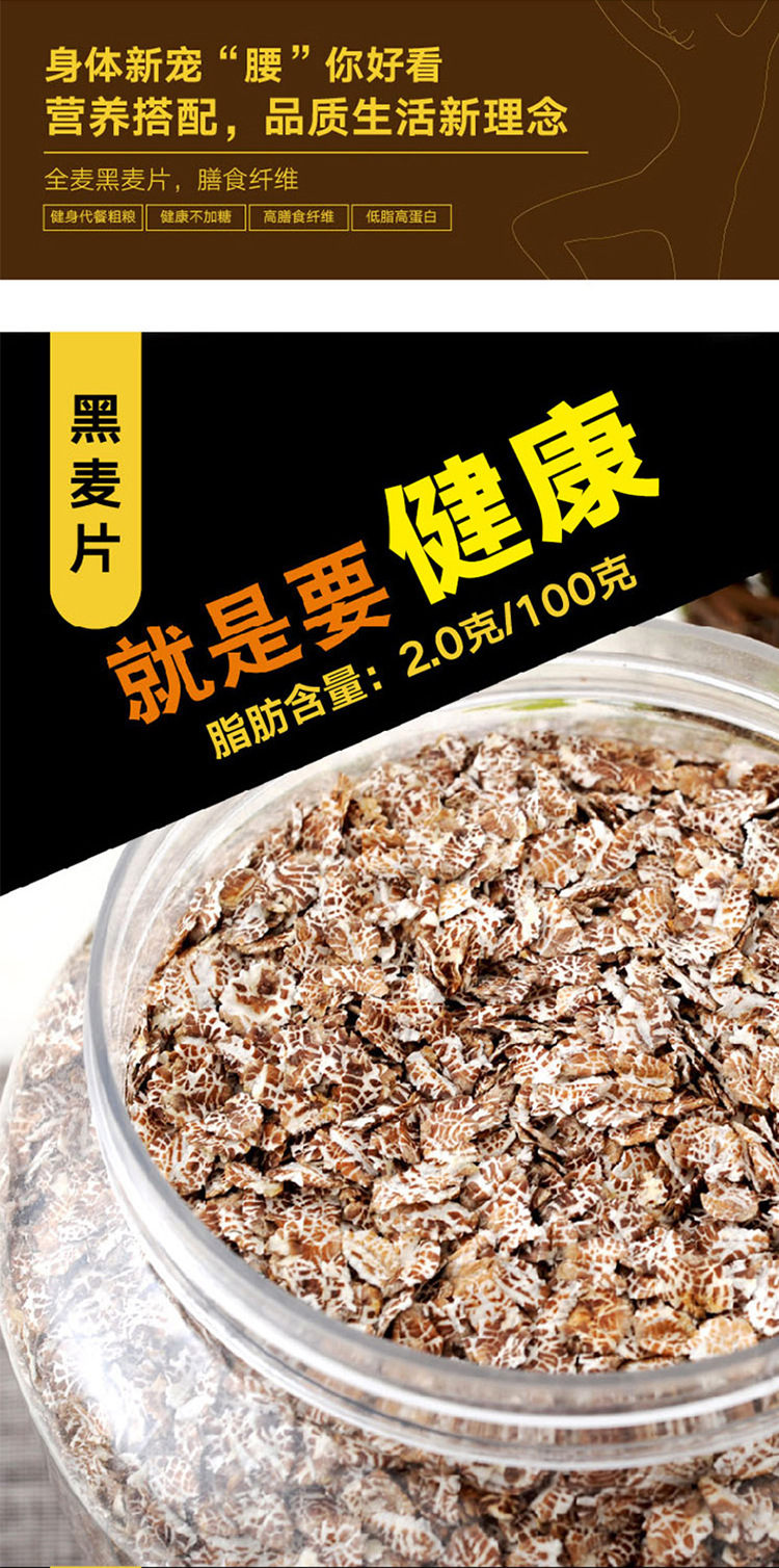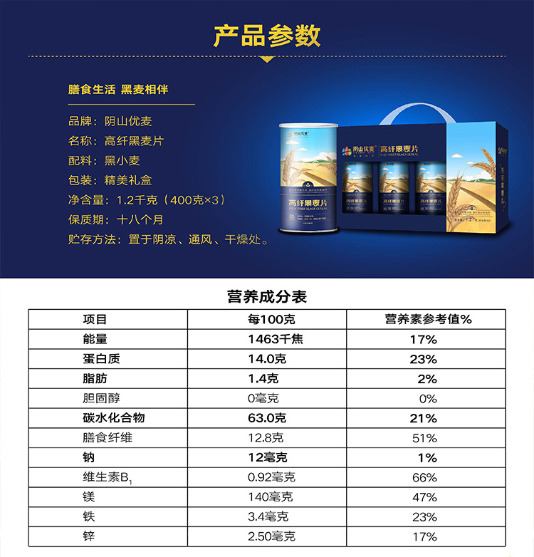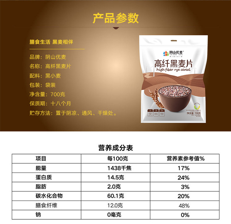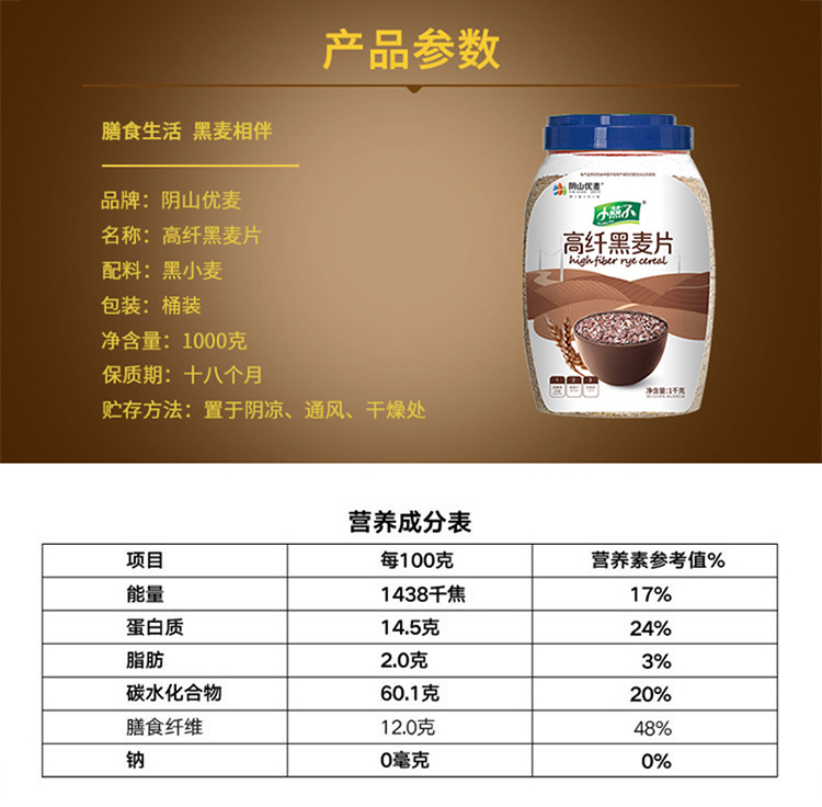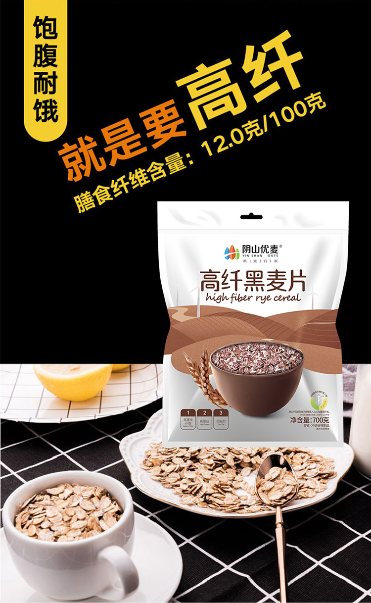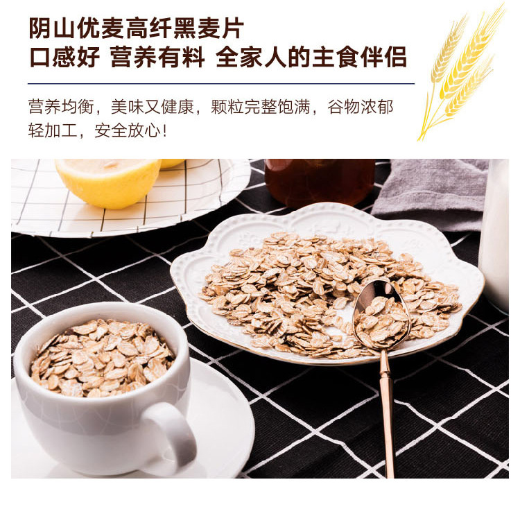 商品名称:阴山优麦高纤黑麦片桶装罐装袋装原味煮食早餐代餐成人代餐燕麦片早餐