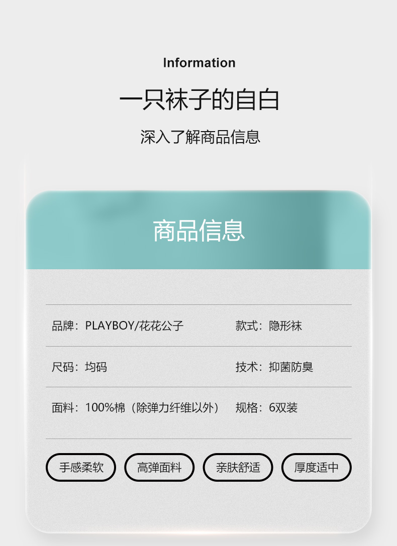 商品名称:花花公子6双装袜子男士短袜纯棉防臭吸汗船袜全棉夏季薄款透气抗菌休闲男隐形袜子