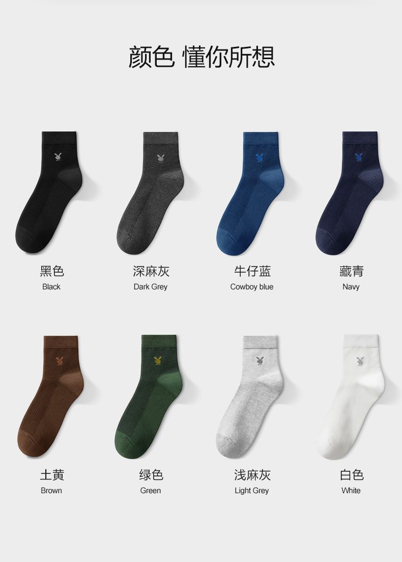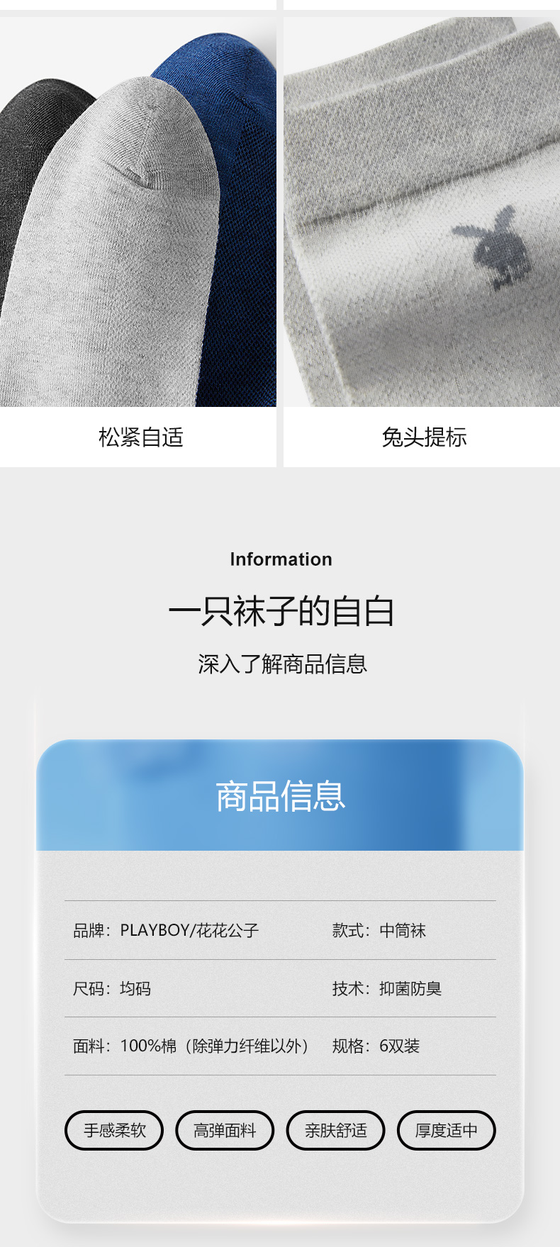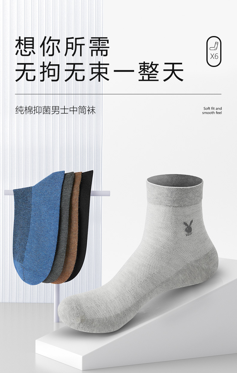 商品名称:花花公子6双男士袜子男纯棉中筒防臭吸汗春秋抗菌全棉男式长袜棉袜