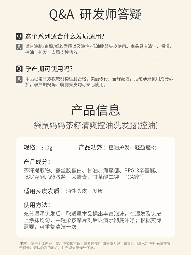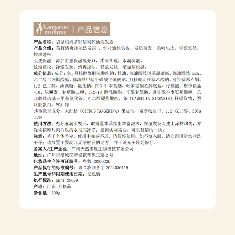商品名称:【控油】袋鼠妈妈准孕妇洗发水茶籽控油洗发露洗成人专用护肤品清洁止痒保湿可用300g