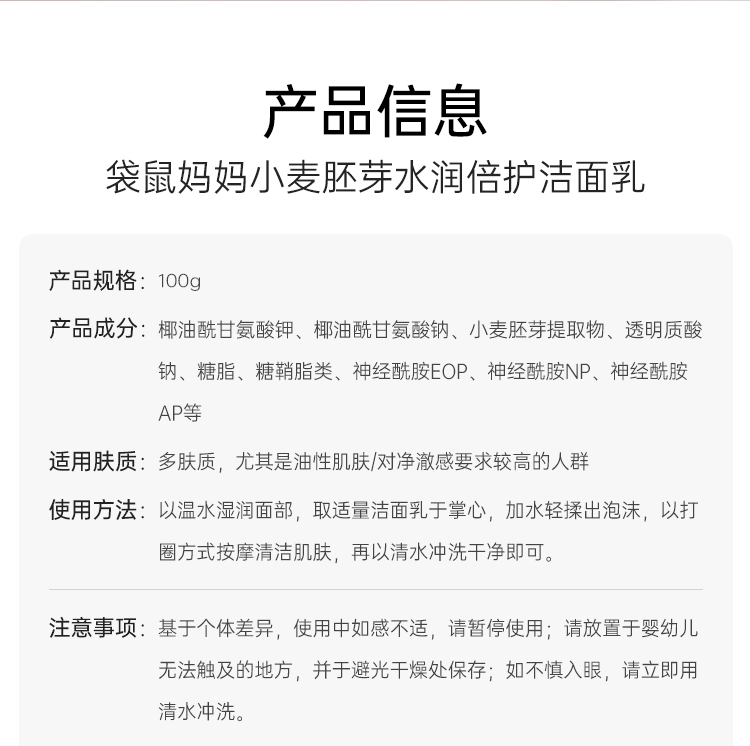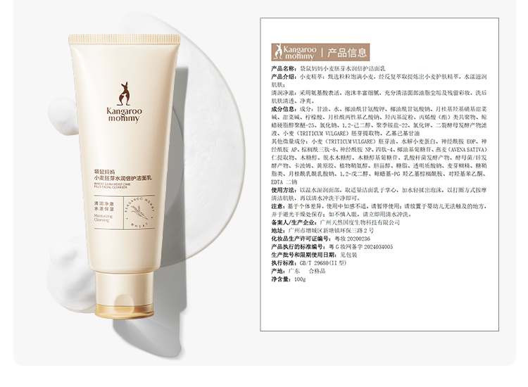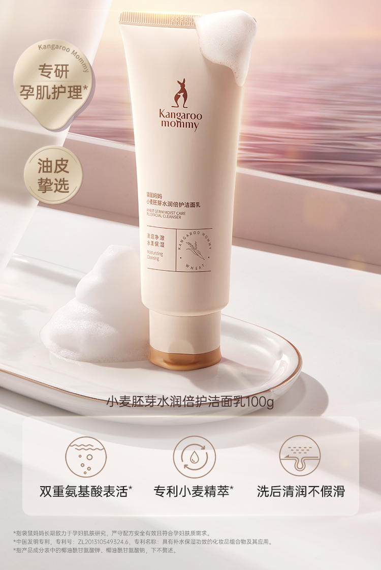 商品名称:袋鼠妈妈 【深层清洁】准孕妇护肤品小麦洗面奶洁面乳不紧绷补水保湿清洁洁面乳100g