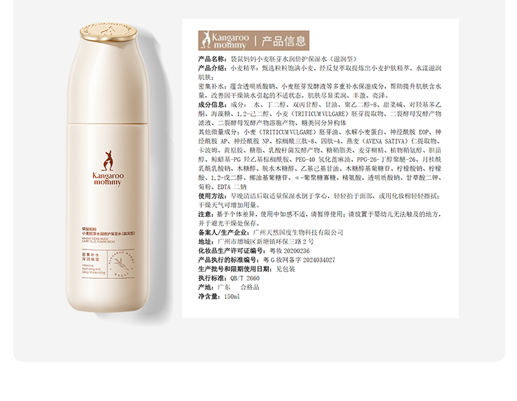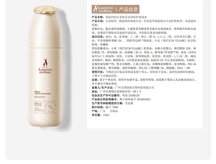 商品名称:【小麦柔肤水】袋鼠妈妈准孕妇爽肤水保湿补水柔肤水可专用护肤品小麦清爽化妆水150ml