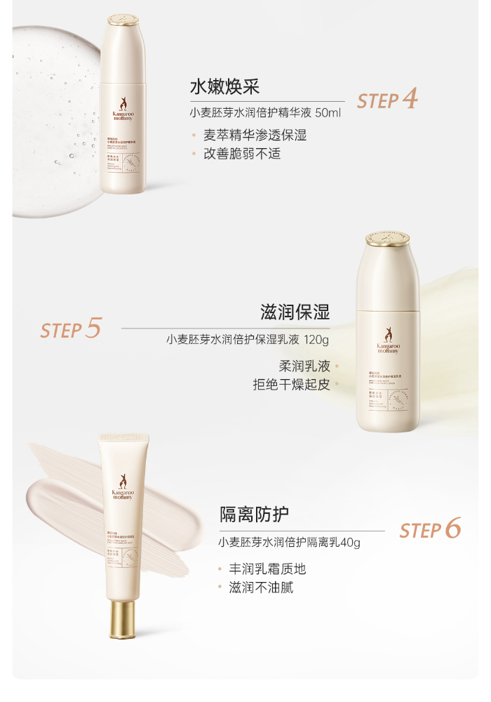 商品名称:【品牌直供】袋鼠妈妈洁面水乳液精华隔离眼霜补水保湿准孕妇可用小麦护肤品单支发货
