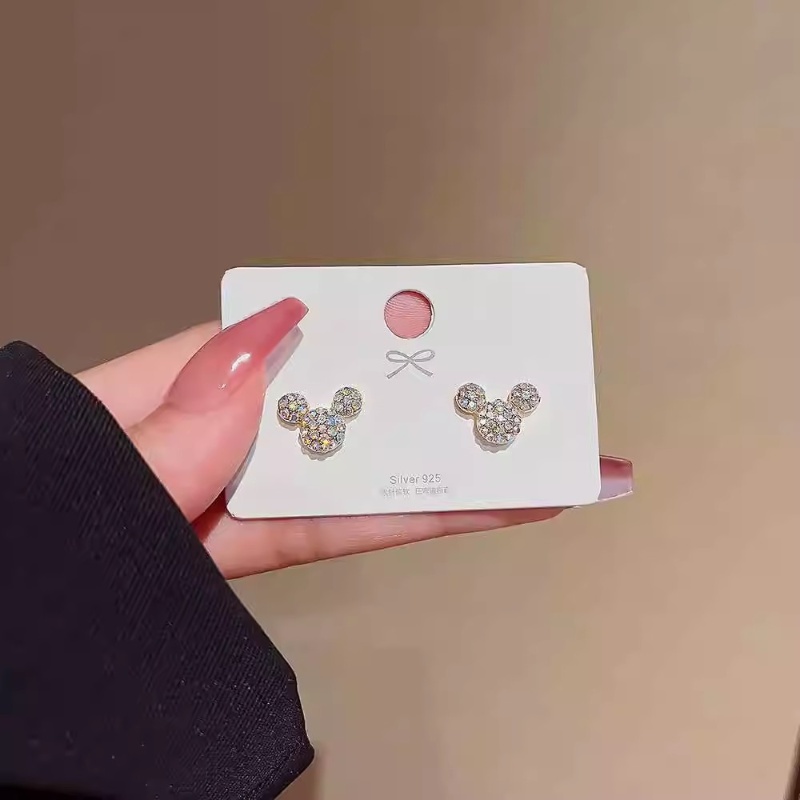 彤彤兔 S925银针新款可爱米奇头满钻耳钉精致白钻立体老鼠耳环东大门耳饰