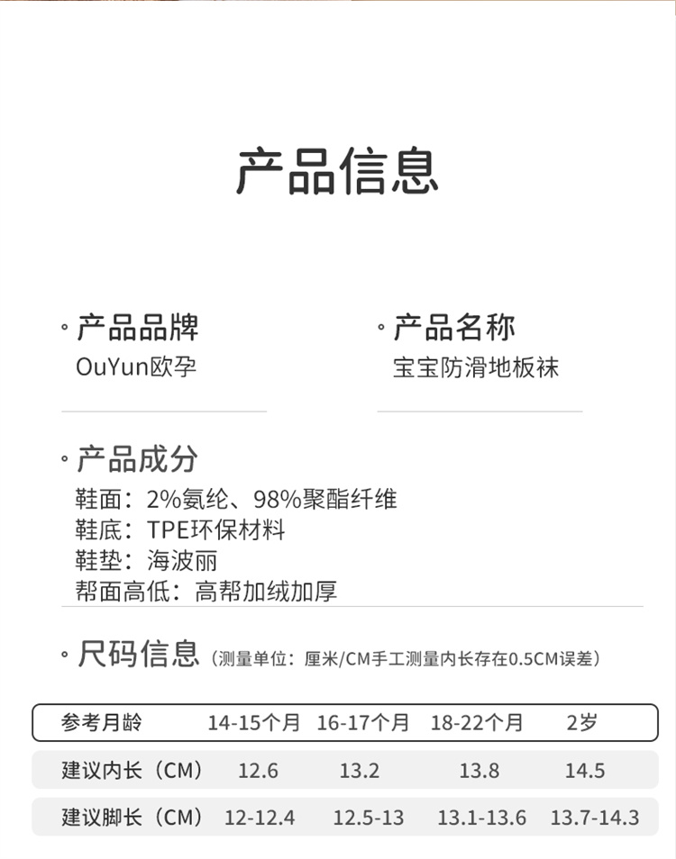 商品名称:欧孕宝宝加厚学步袜婴儿宝宝防滑地板袜学习训练袜男女宝宝宝宝鞋女童男童软底