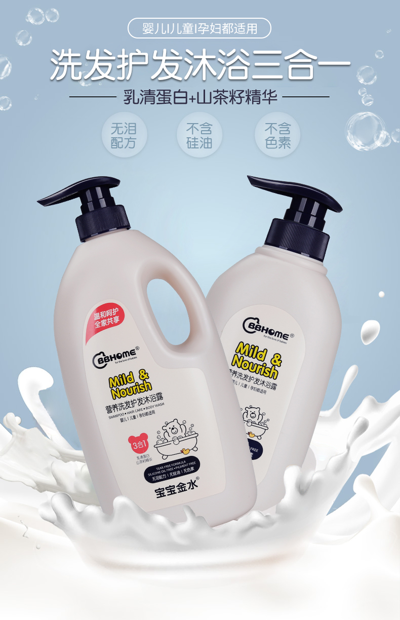 宝宝金水BBHOME营养洗发护发沐浴露三合一无泪无硅油山茶籽温和不刺激500ml