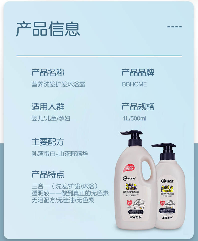 商品名称:宝宝金水BBHOME营养洗发护发沐浴露三合一无泪无硅油山茶籽温和不刺激500ml