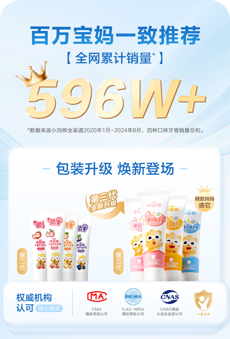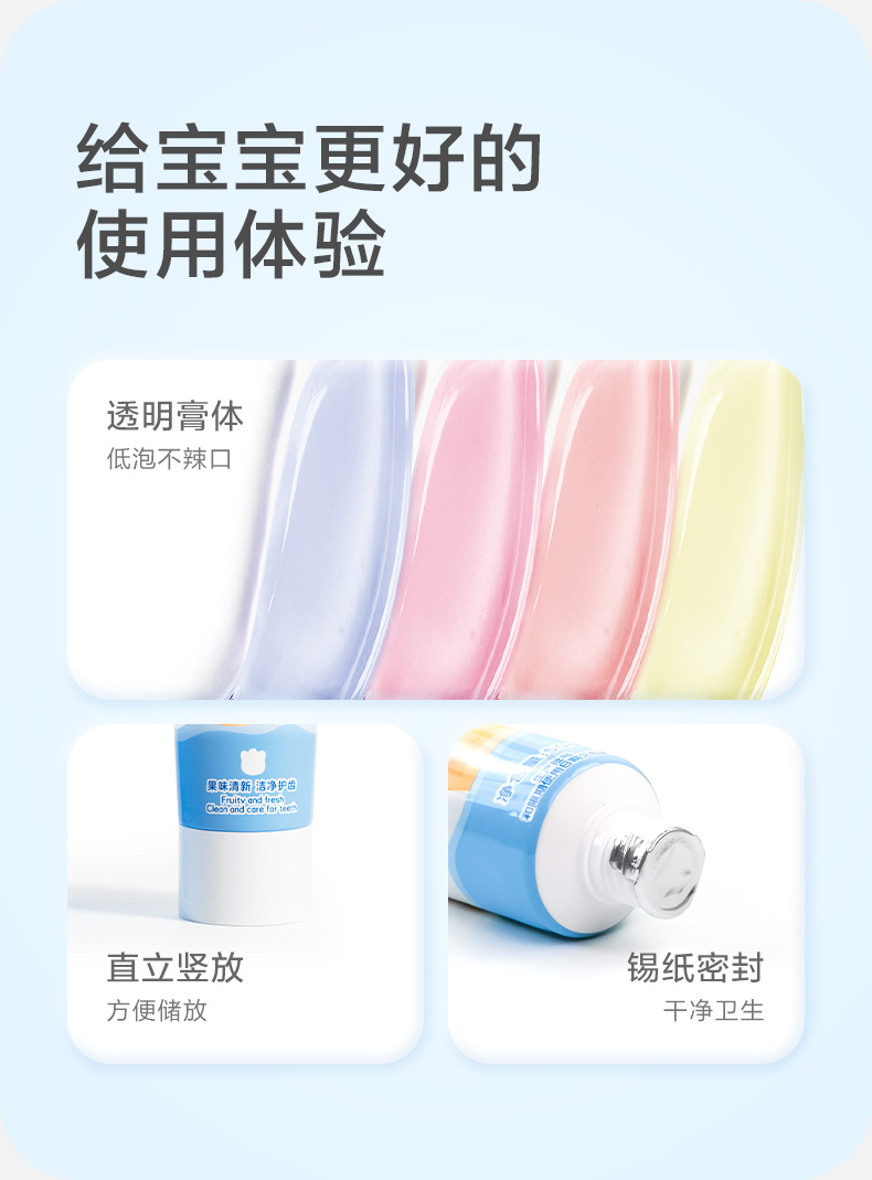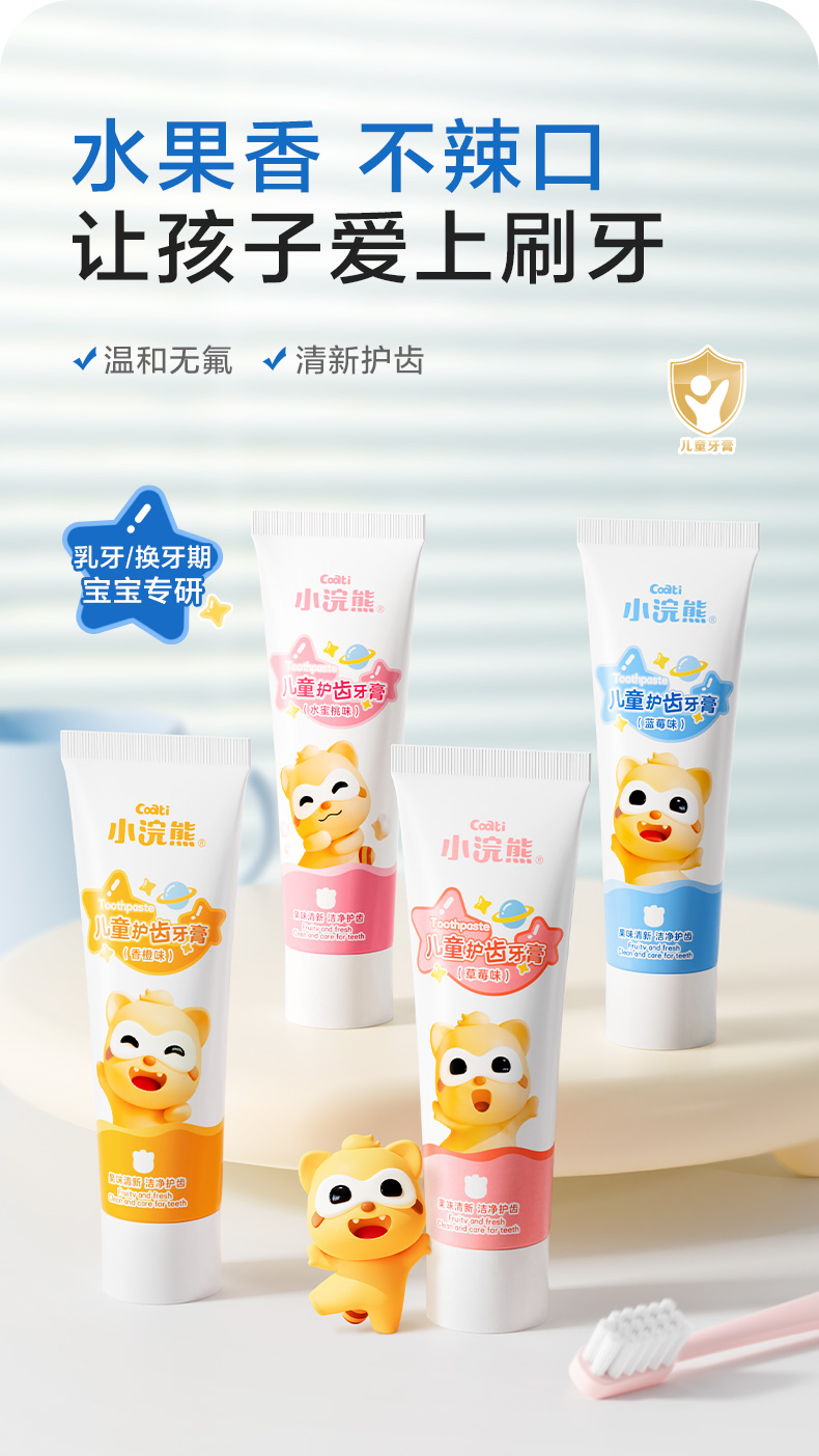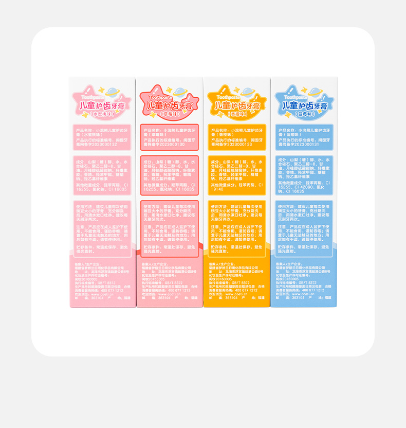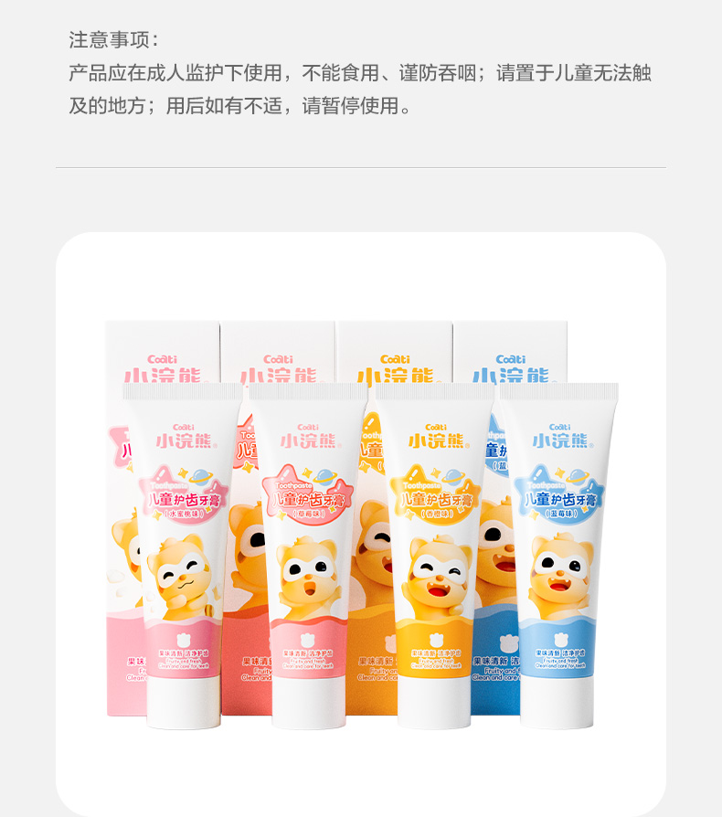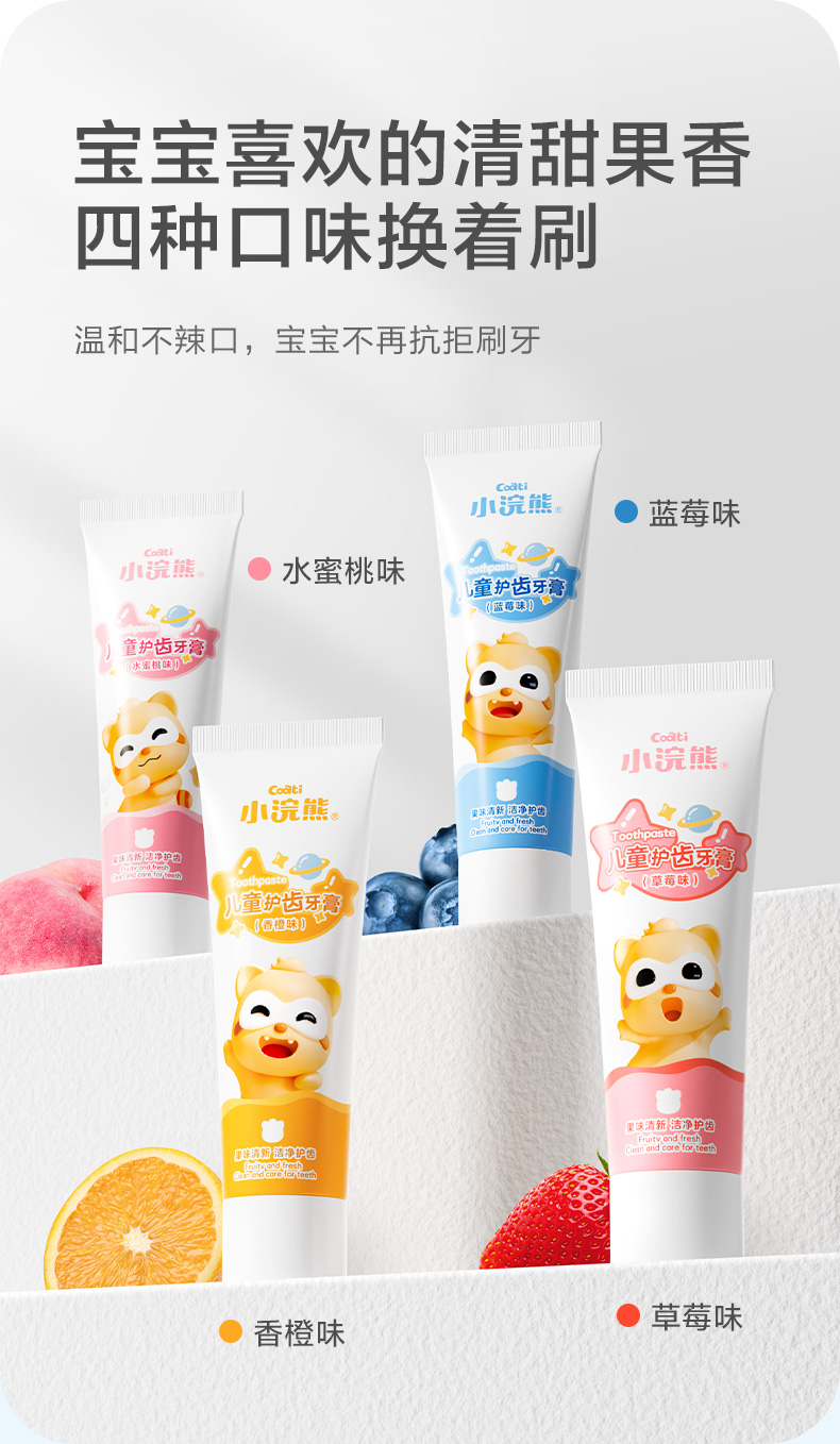 商品名称:【品牌直供】小浣熊儿童护齿牙膏50g*4支 草莓+蓝莓+水蜜桃+香橙口味2-12岁以上无氟可用