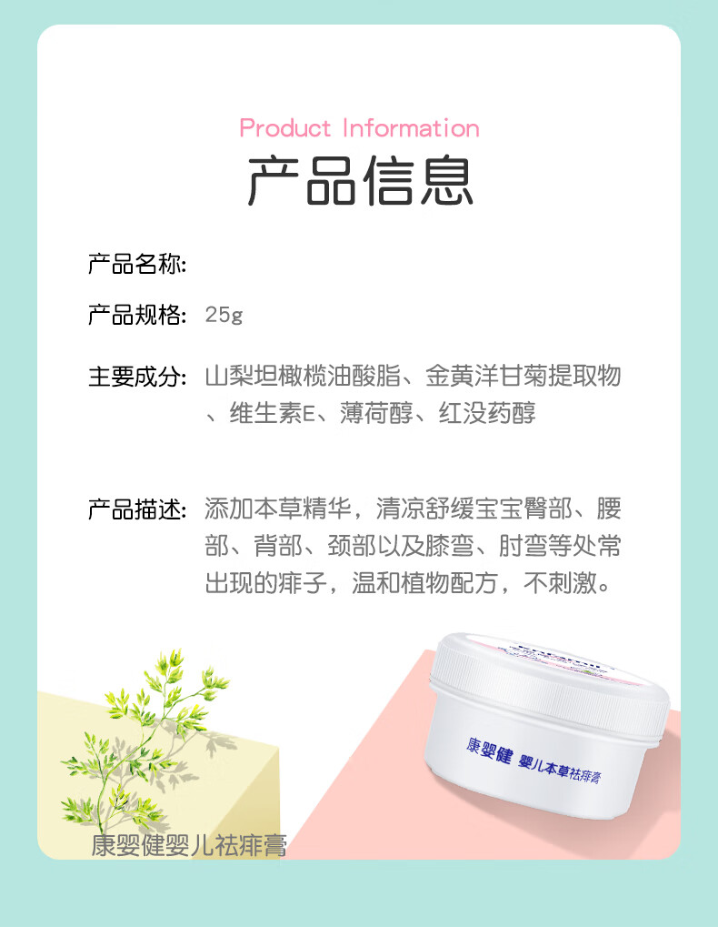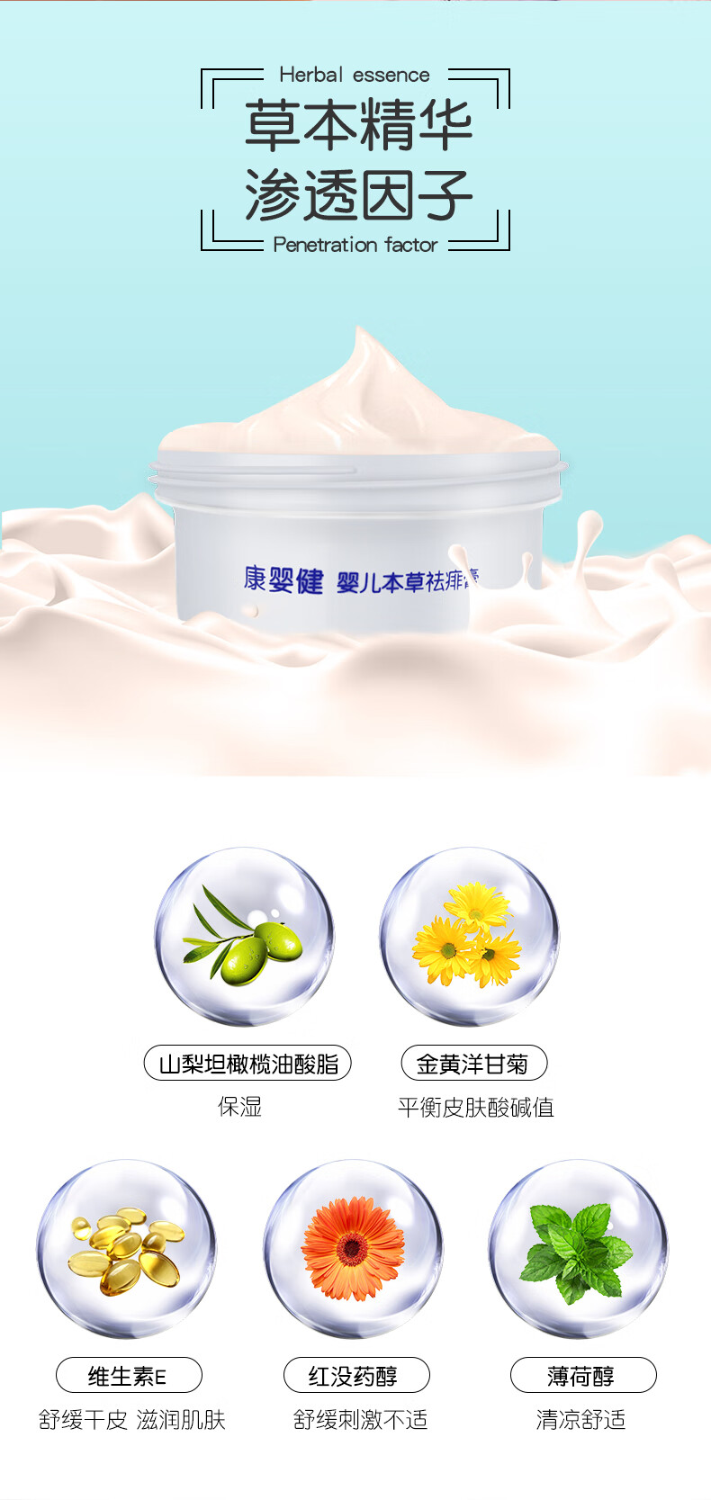 商品名称:康婴健婴儿祛痱膏纯植物配方新生儿宝宝痱子膏红热疹子热痱膏草本止痒膏婴儿去痱膏