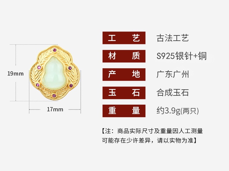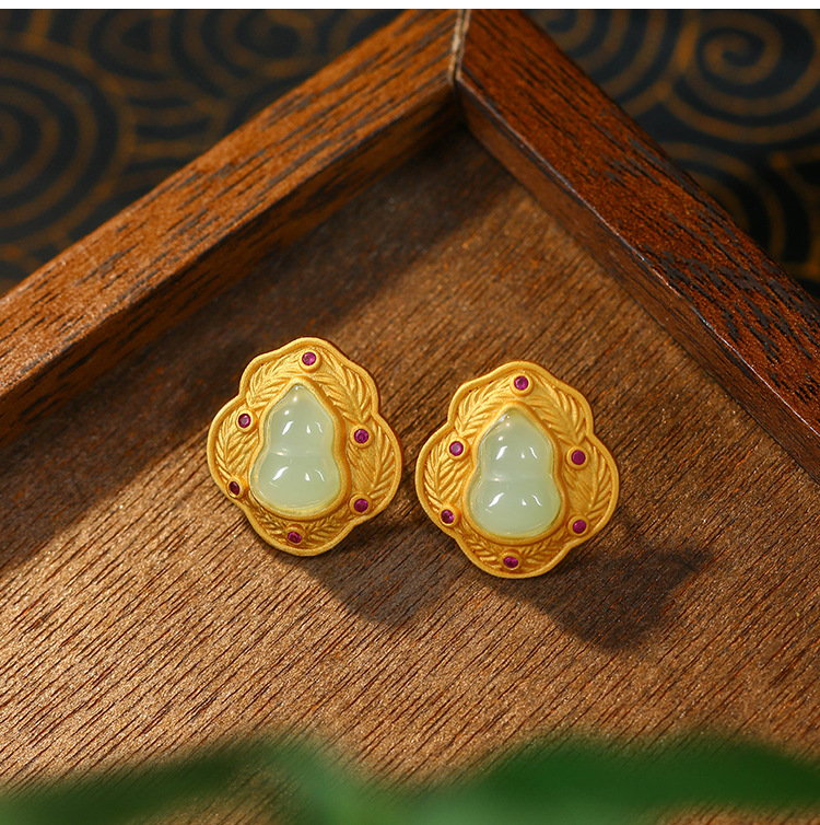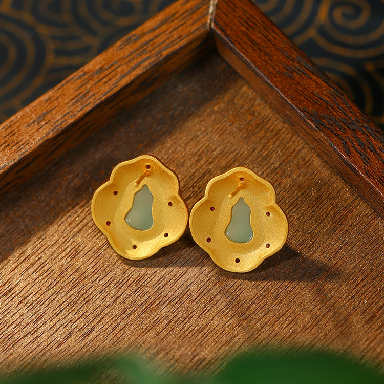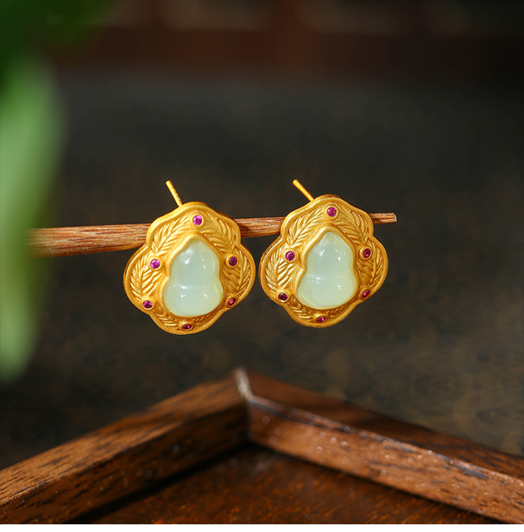 商品名称:彤彤兔 中国风设计S925纯银针镀金高级感合成玉石福禄葫芦耳钉女