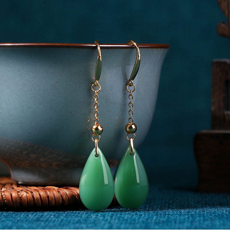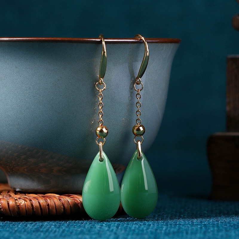 彤彤兔 S925银针民族风手工耳饰阳绿水滴合成玉石耳饰耳钩