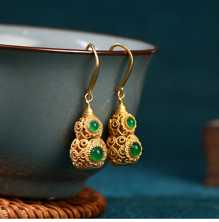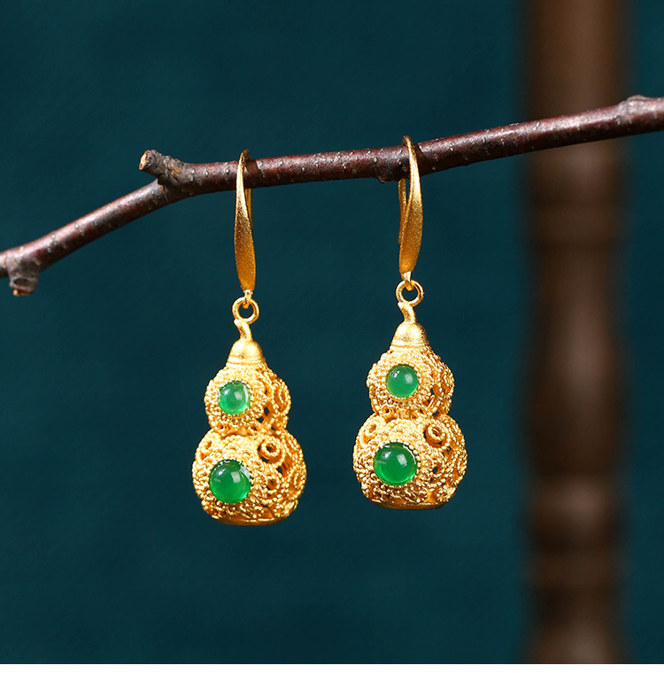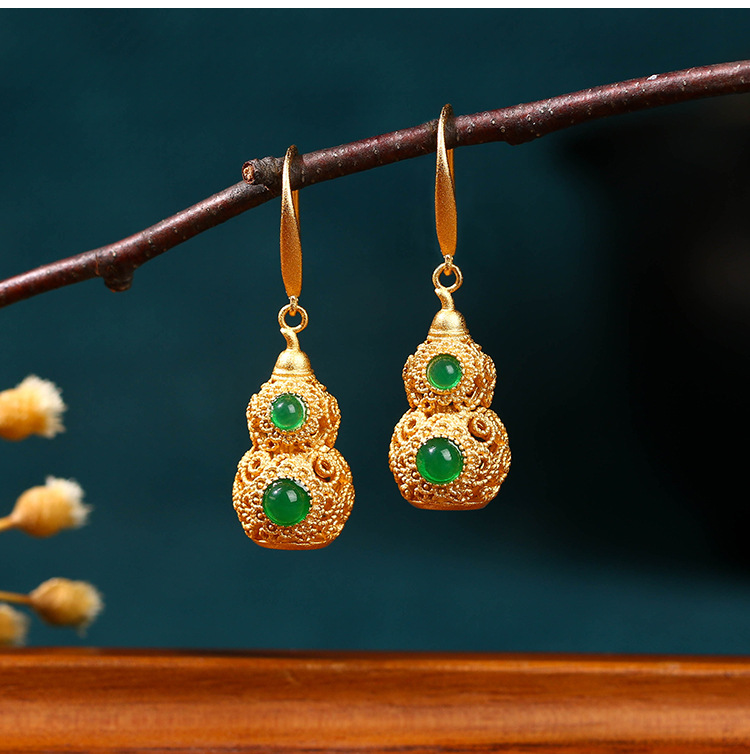 彤彤兔 不易掉色福緑葫芦复古典雅合成玉石碧玉镀金耳环宫廷风镶嵌耳饰女