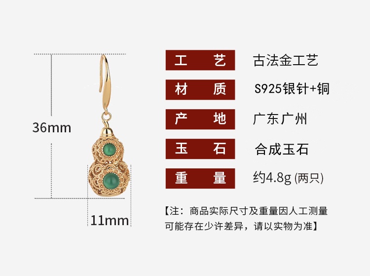 商品名称:彤彤兔 不易掉色福緑葫芦复古典雅合成玉石碧玉镀金耳环宫廷风镶嵌耳饰女