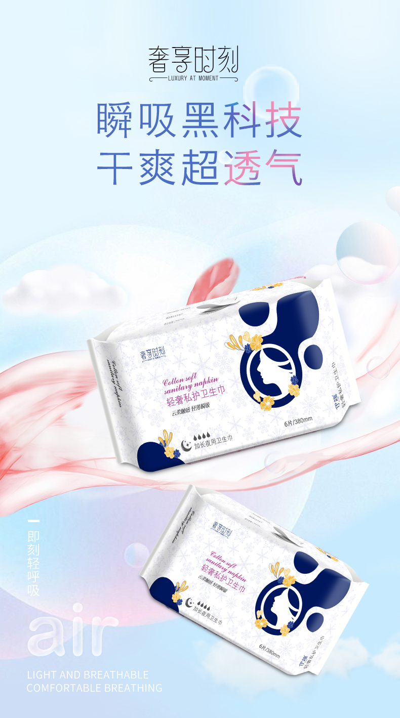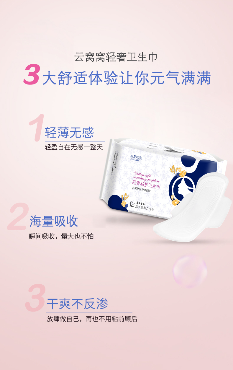 商品名称:【3包送试用装】伊趣云窝窝奢享棉柔超薄瞬吸卫生巾薰衣草祛味姨妈巾加长夜用6片380mm