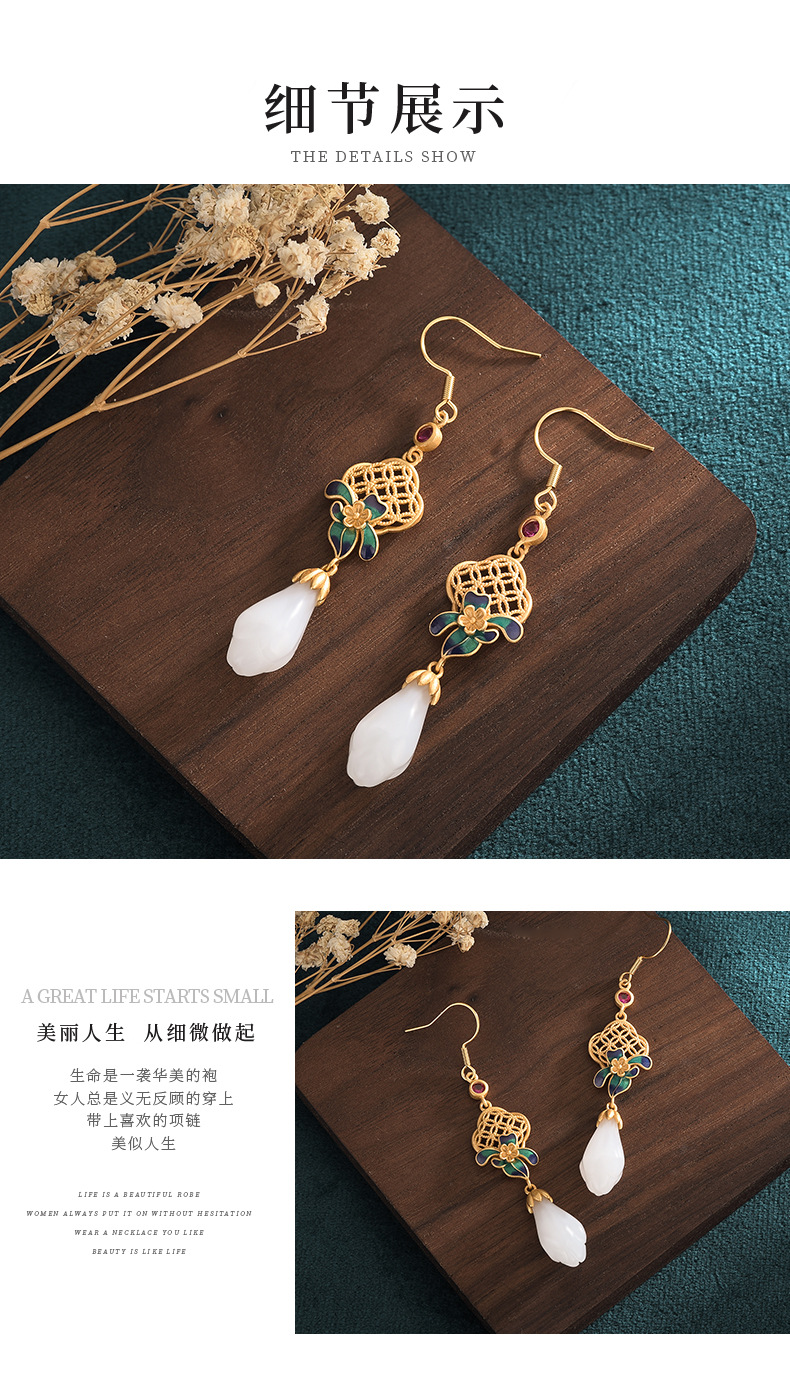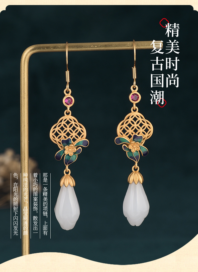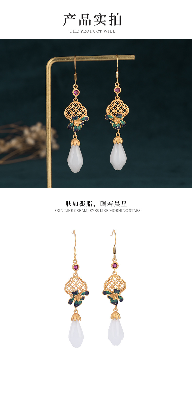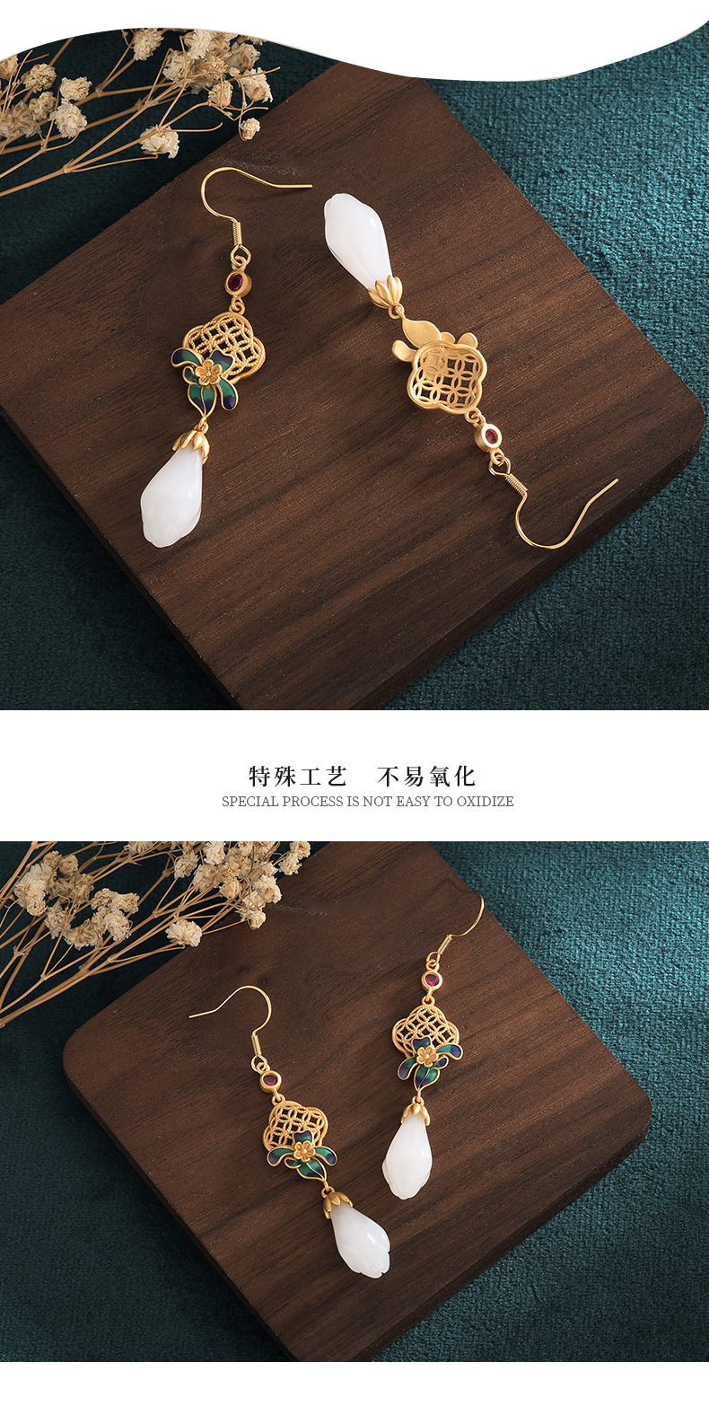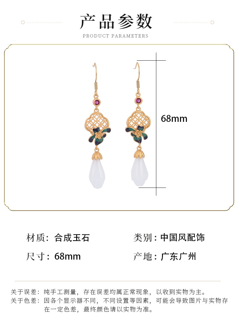 商品名称:彤彤兔 首饰国潮风旗袍汉服耳饰古法镀金珐琅合成玉石兰花耳环耳坠