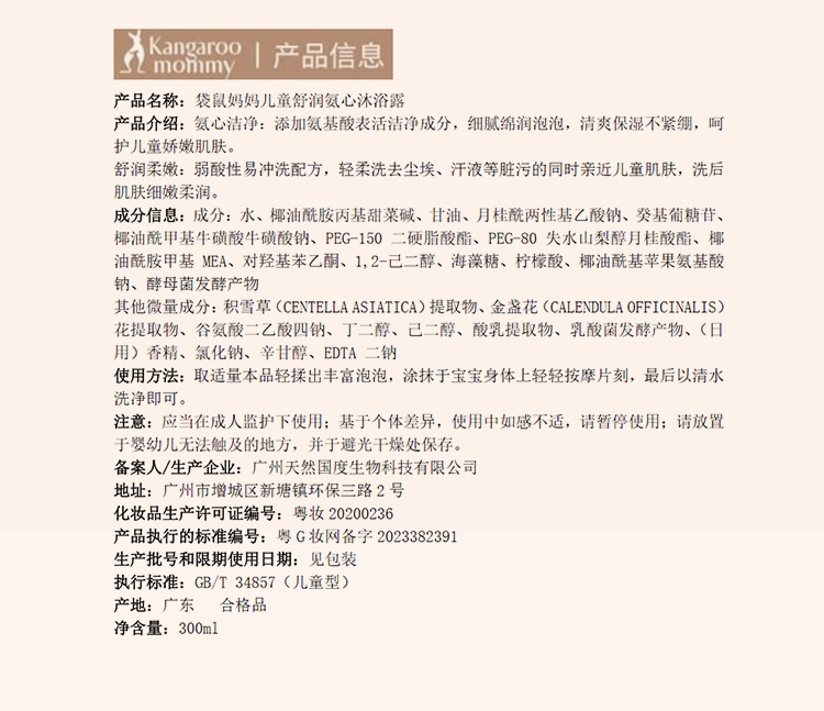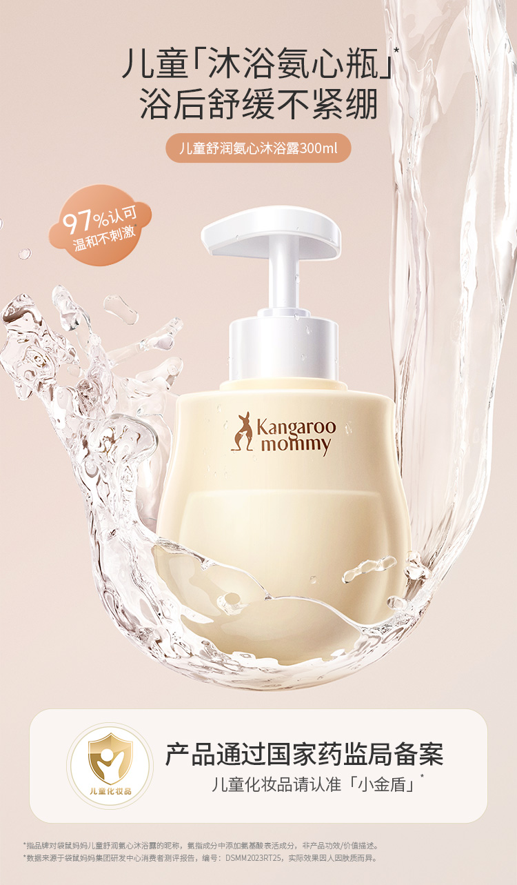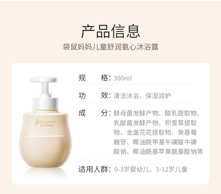 商品名称:袋鼠妈妈儿童沐浴露新生宝宝可用温和低泡泡清洁沐浴专用婴儿洗护沐浴0-12岁正品300ml