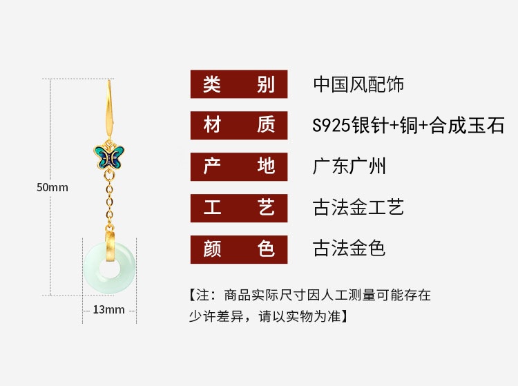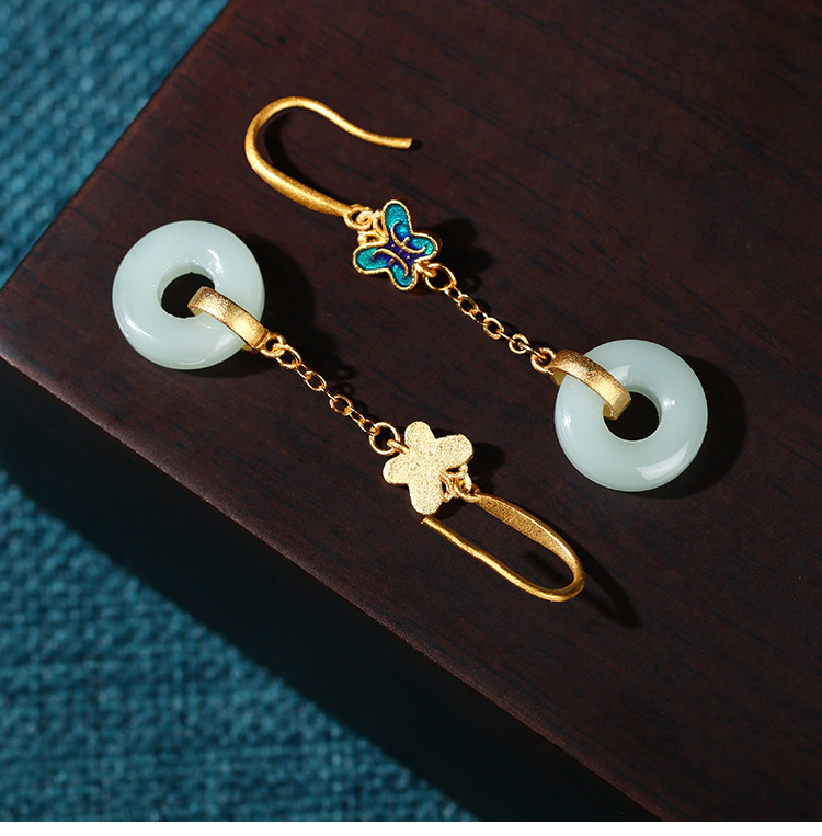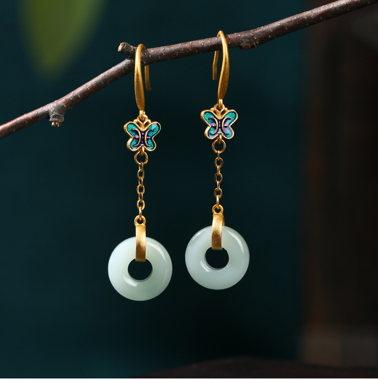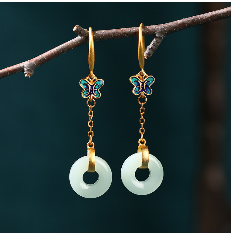 商品名称:彤彤兔 国潮宫廷风冷珐琅小众蝴蝶合成玉石平安扣复古耳环