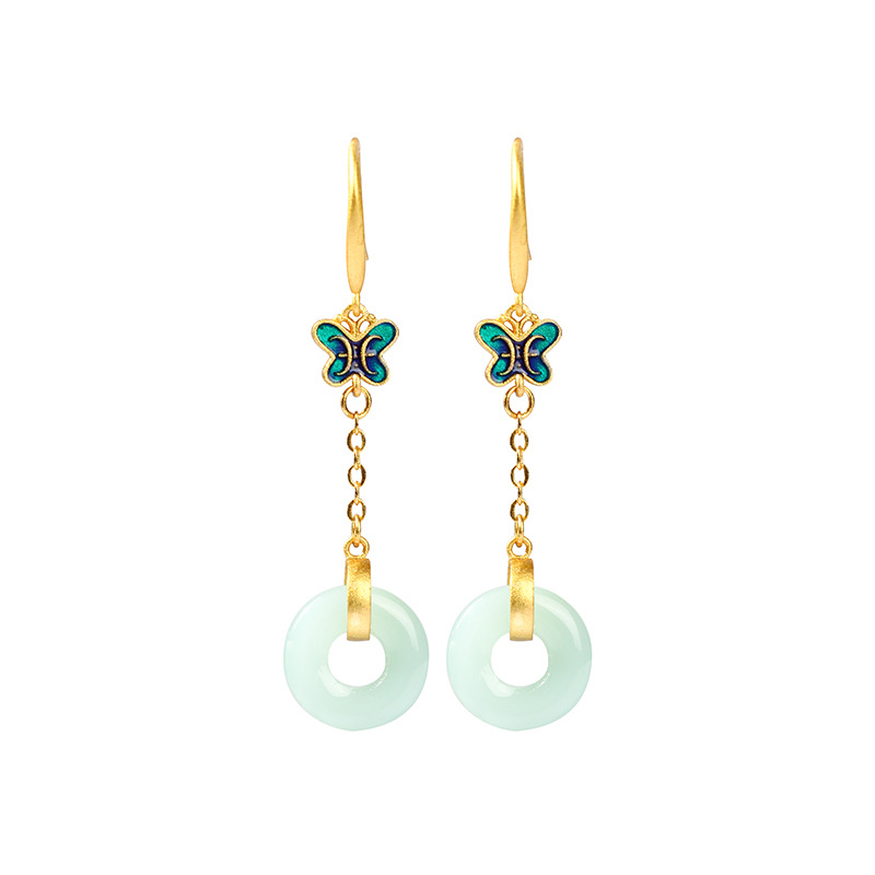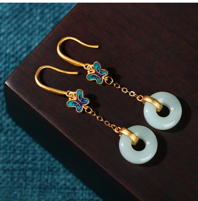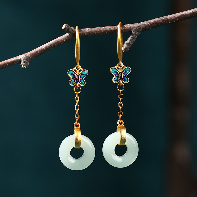 彤彤兔 国潮宫廷风冷珐琅小众蝴蝶合成玉石平安扣复古耳环