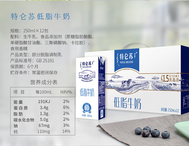 商品名称:蒙牛 特仑苏低脂牛奶250ML×12盒整箱低脂低卡营养早餐奶