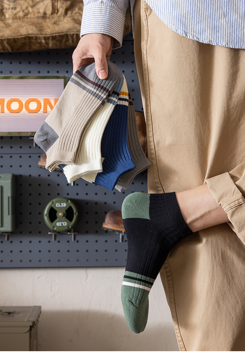 【5双装】朝暮栖止棉袜子男士春夏季新款时尚简约透气横条拼色船袜短筒棉袜子