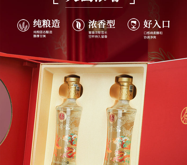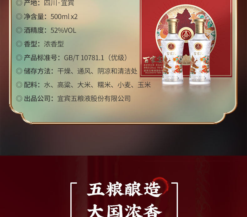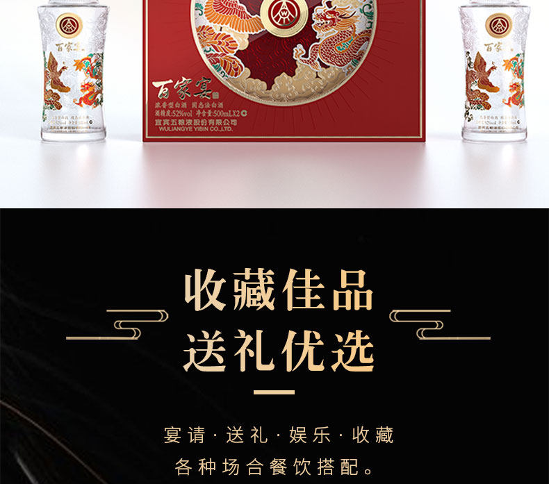 商品名称:五粮液百家宴龙凤呈祥浓香型52度500ml*2瓶/盒白酒四川宜宾粮食酒礼盒装送礼宴请聚会