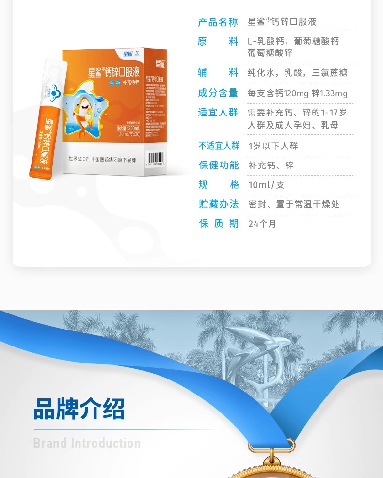 商品名称:星鲨 钙锌口服液-30袋/盒