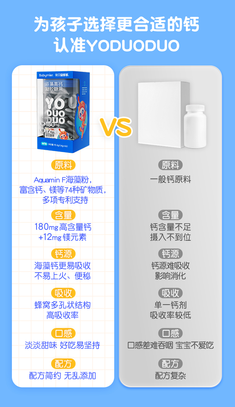 【升级180mg】贝蜜儿YODUODUO葆贝益多多海藻高钙儿童进口海藻钙液体钙软胶囊非乳钙片66粒