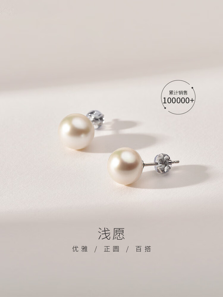 京润珍珠 浅愿G18K金珍珠耳钉8-8.5mm白色圆形百搭耳钉