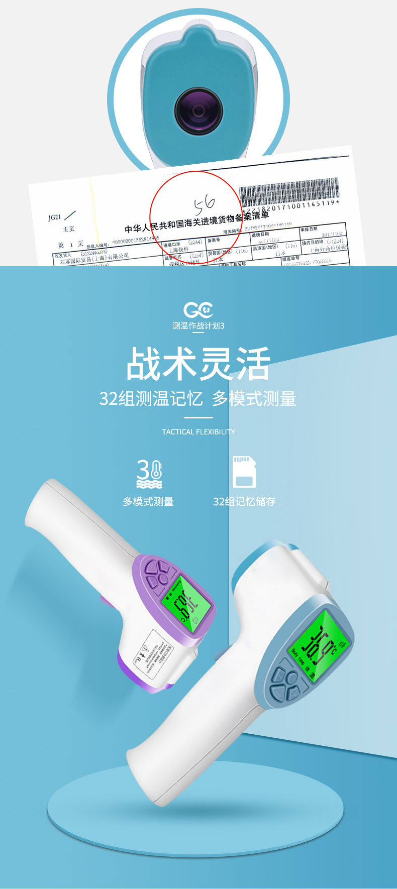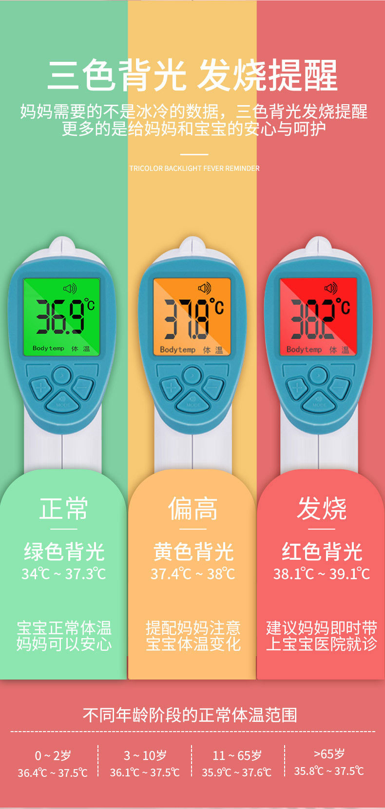 商品名称:三色背光医用红外线儿童非接触式电子体温计体温枪额温枪温度计耳温枪测温中文包装