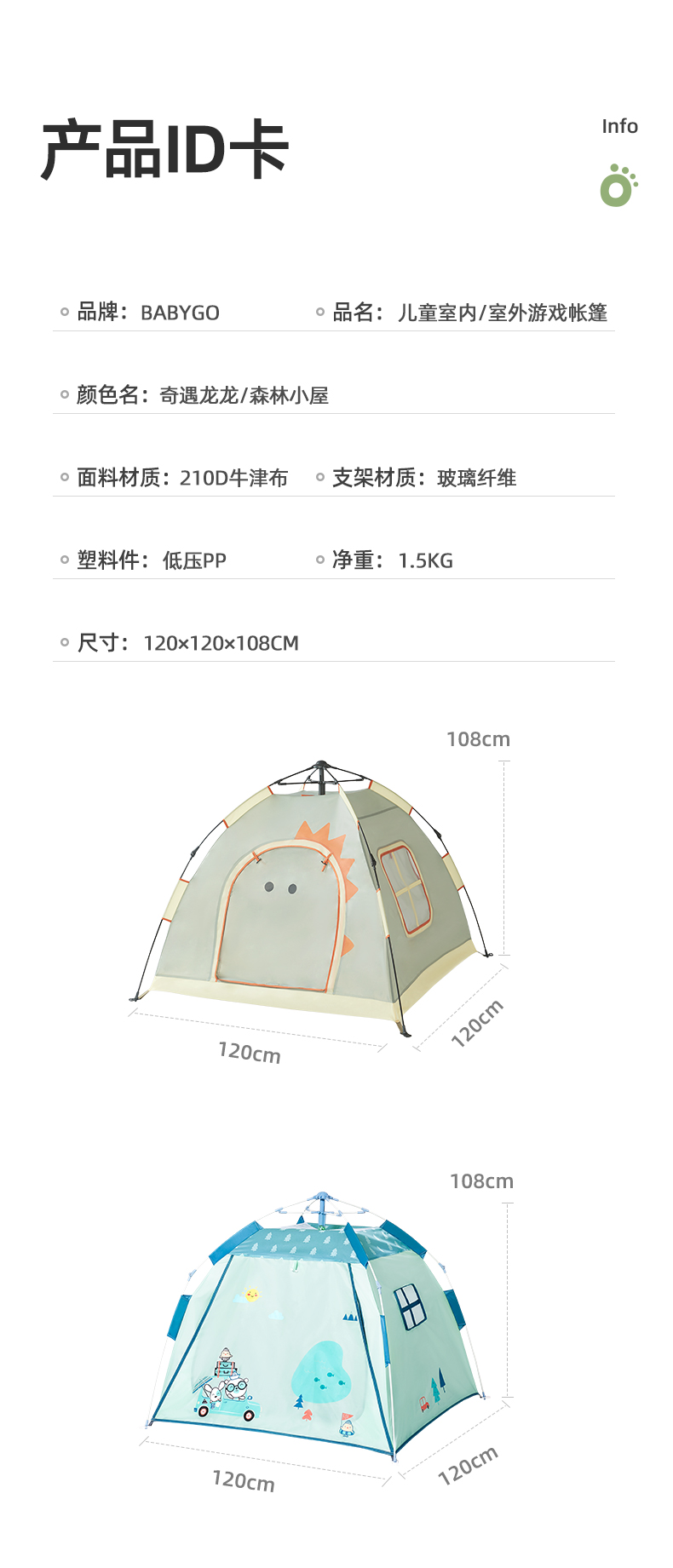 商品名称:BABYGO儿童室内外可用帐篷野营快速折叠收纳帐篷