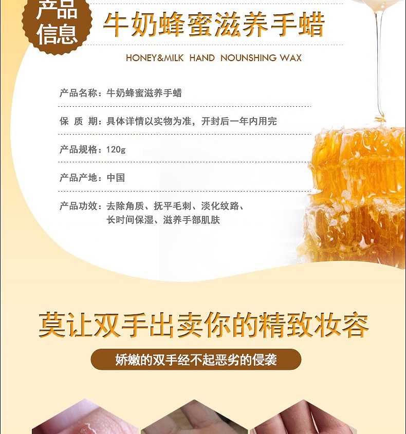 商品名称:莱蔻 牛奶蜂蜜滋养手蜡 改善老茧 淡化手纹 120g