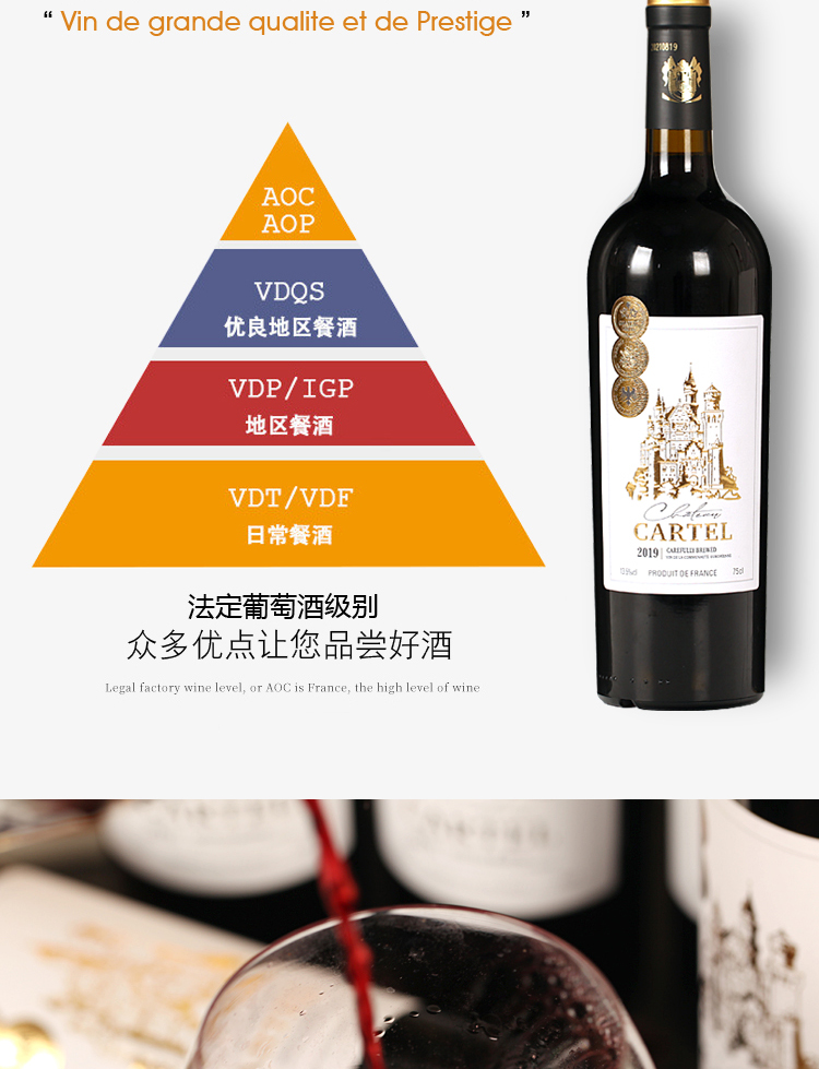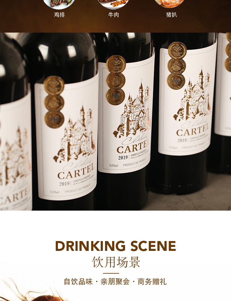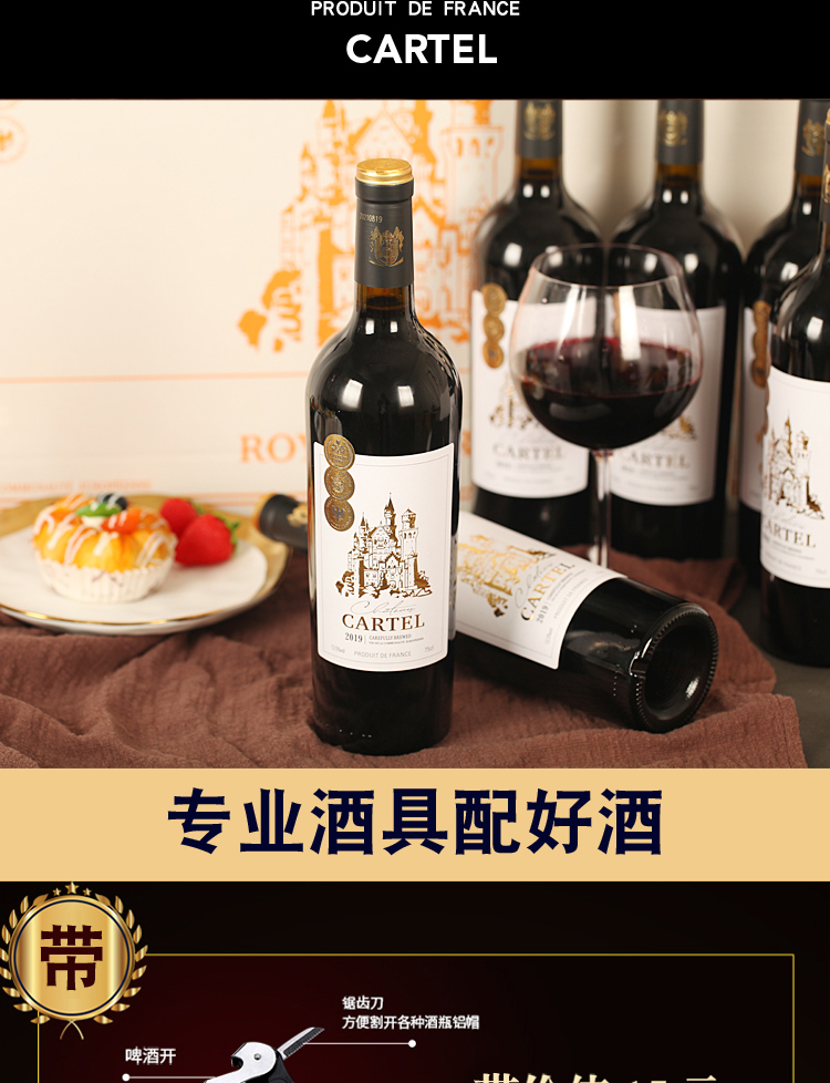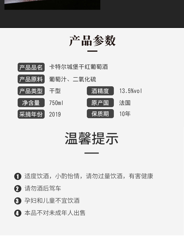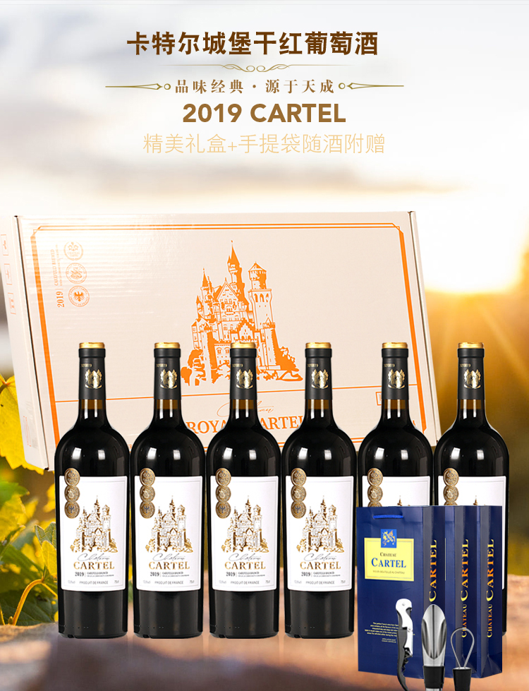 商品名称:卡特尔法国进口红酒城堡干红葡萄酒750ml*6支带精美礼盒3礼袋整箱