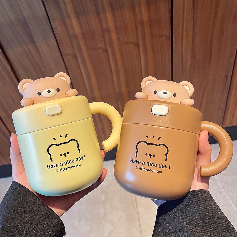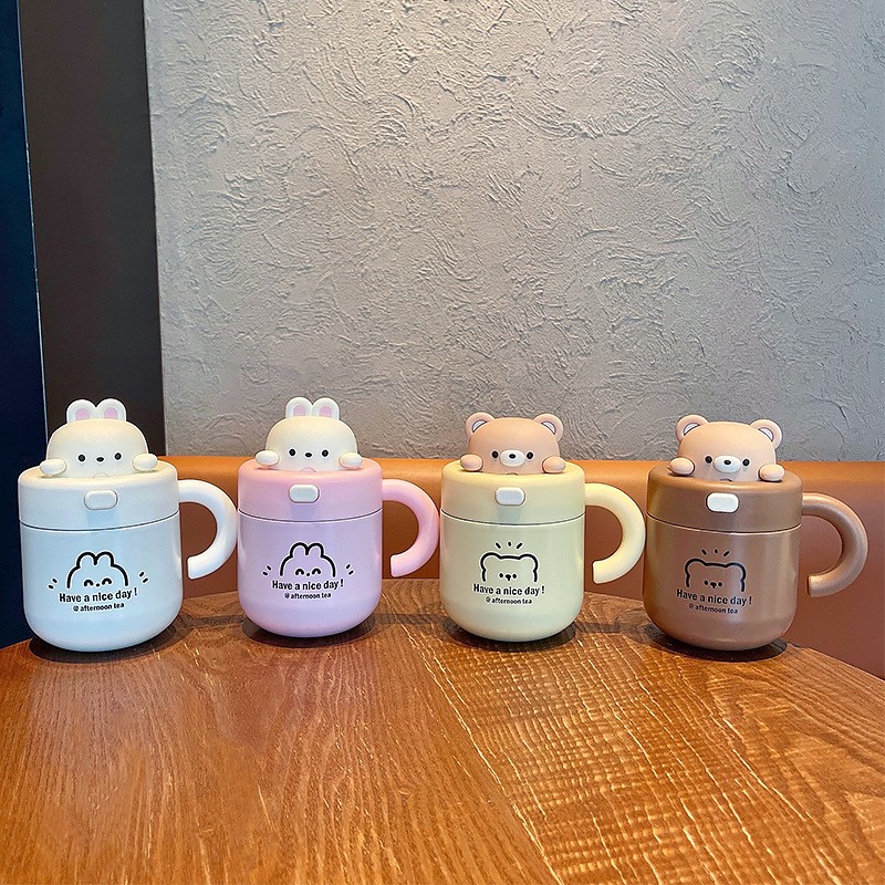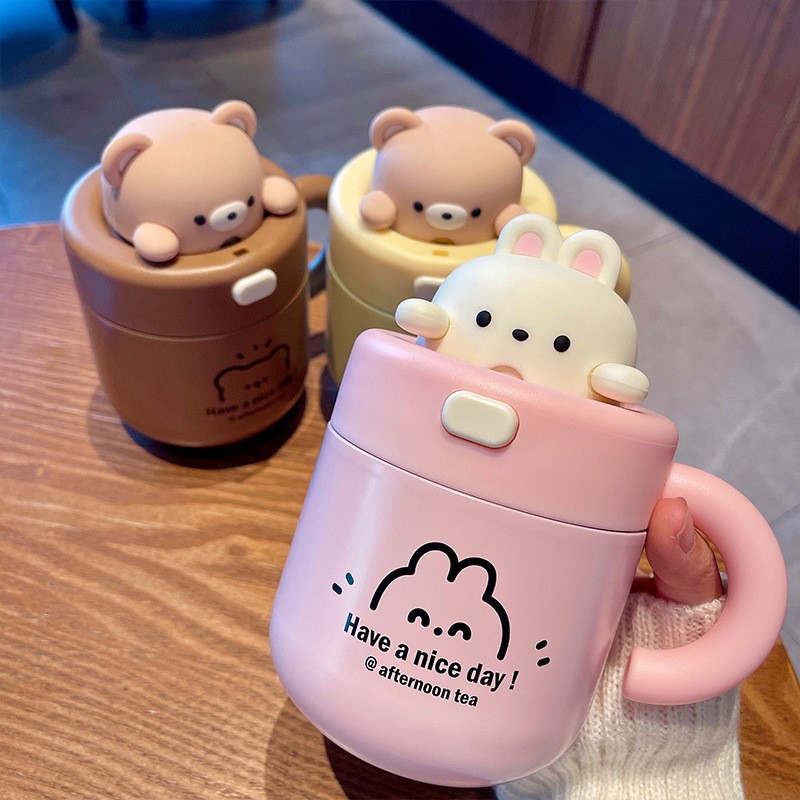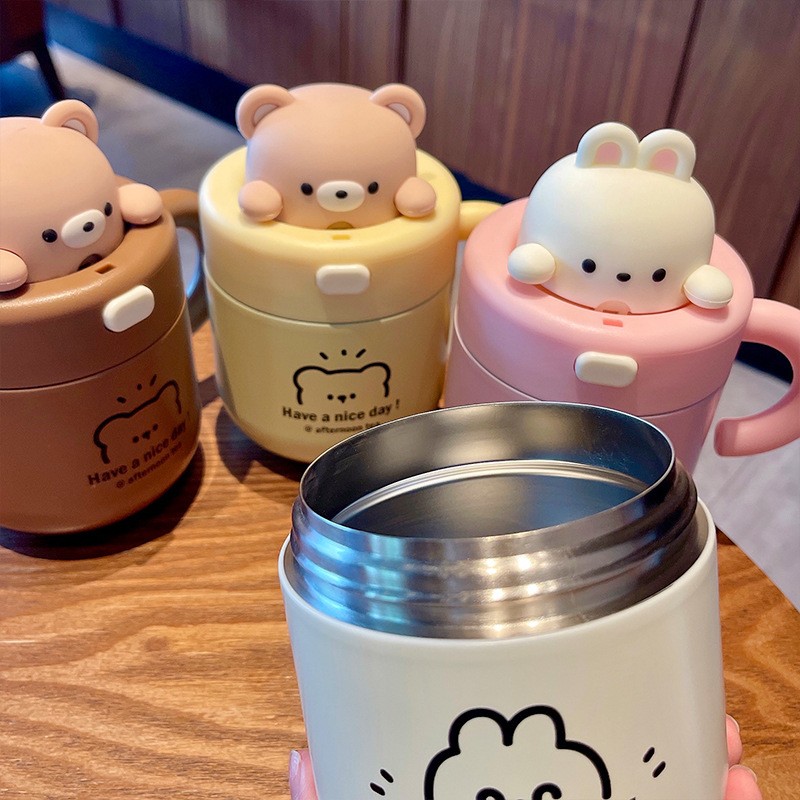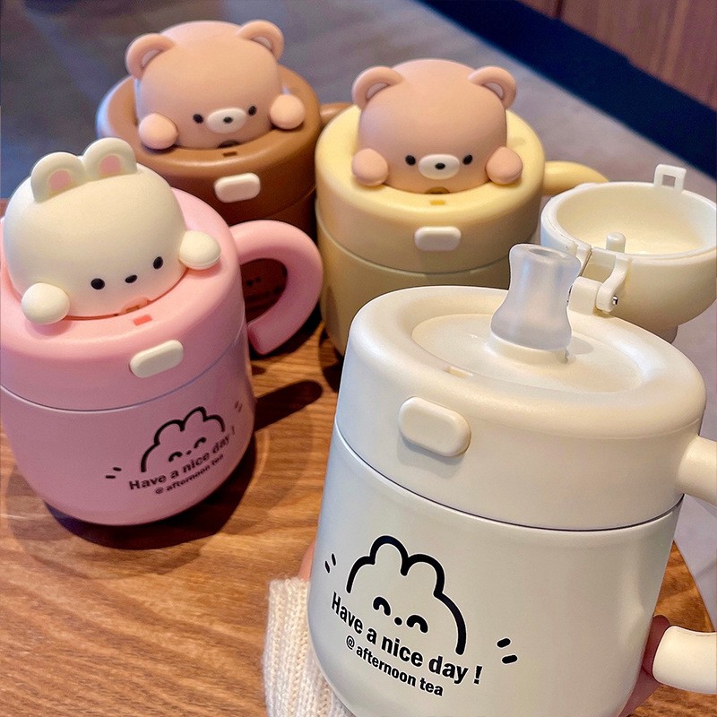 宝宝吸管杯喝水杯可爱小熊公仔办公杯带杯盖女生不锈钢少女心可爱甜美 316保温杯子