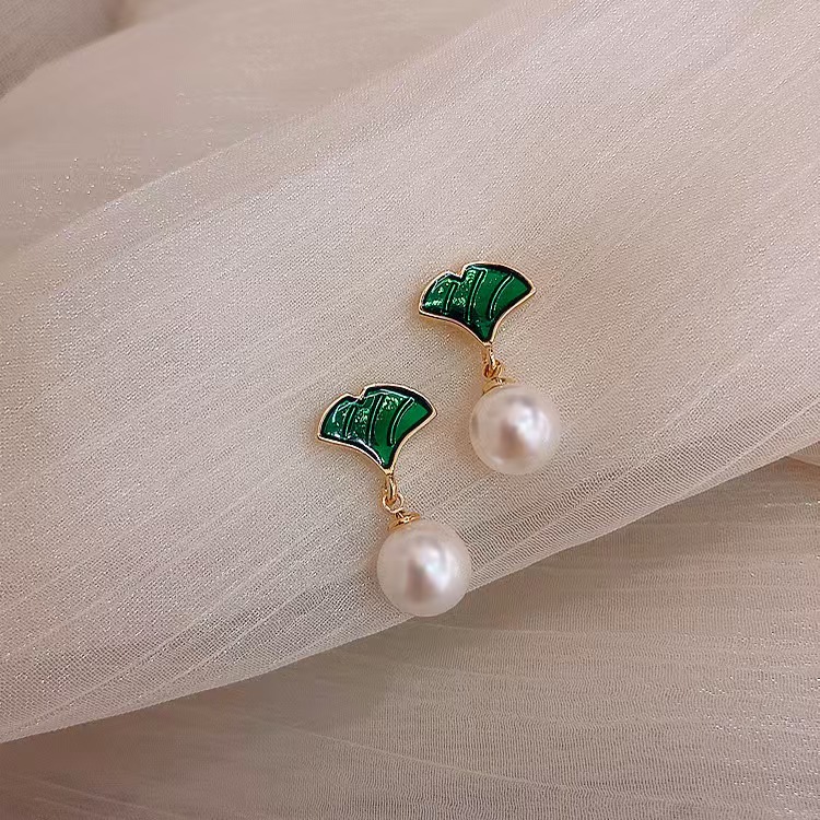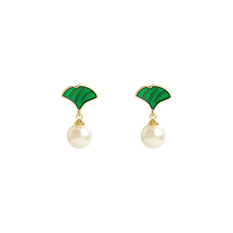 彤彤兔 S925银针韩版简约气质小众绿杏叶珍珠款耳钉气质高级耳饰