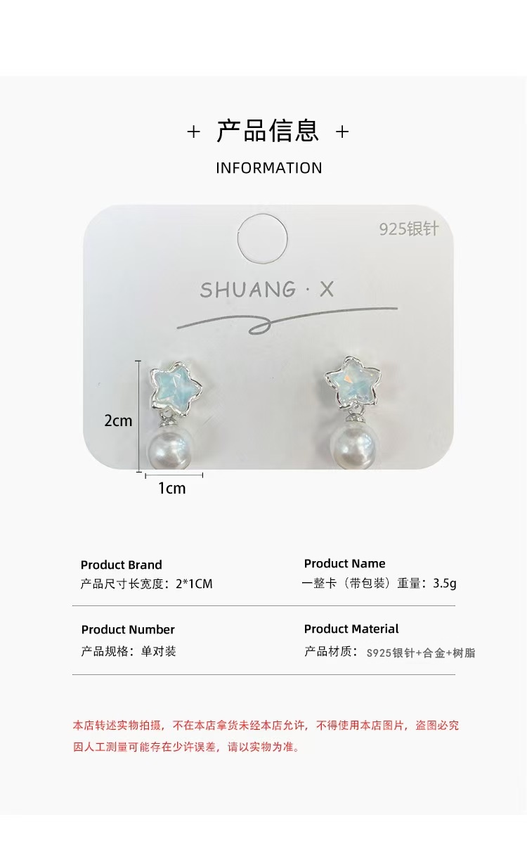 商品名称:彤彤兔 S925银针星星珍珠耳钉女高级感耳环小众设计百搭气质耳饰