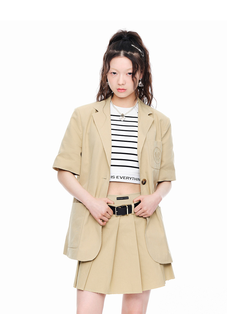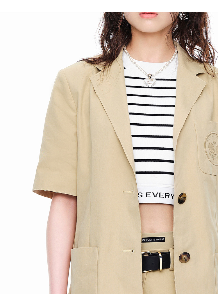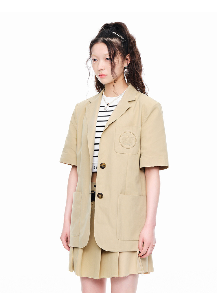 地素春秋复古通勤口袋刺绣宽松短袖垫肩西装外套女 975499