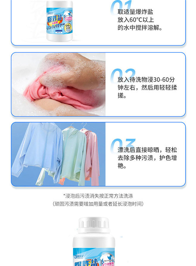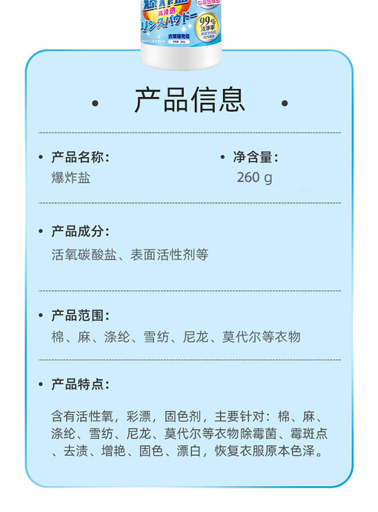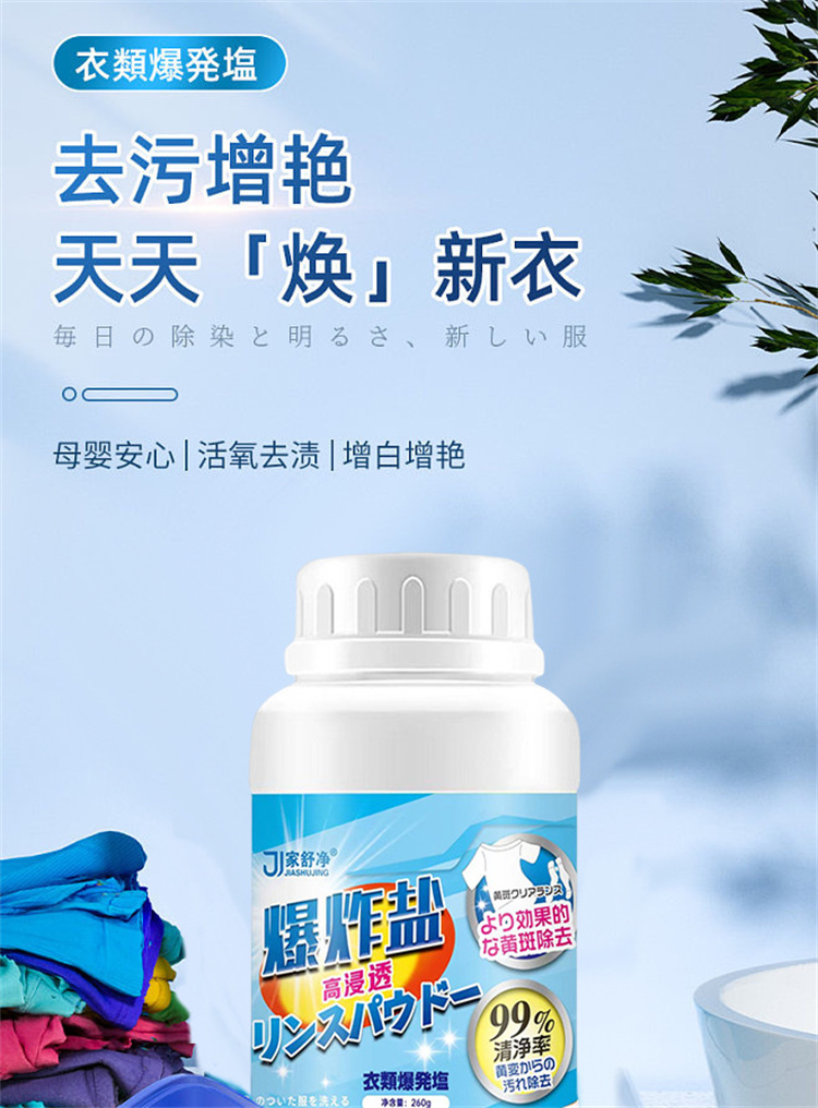商品名称:家舒净爆炸盐260克/瓶增白增艳去污彩漂粉婴幼儿去黄增白泡泡粉活氧爆炸盐除垢除菌