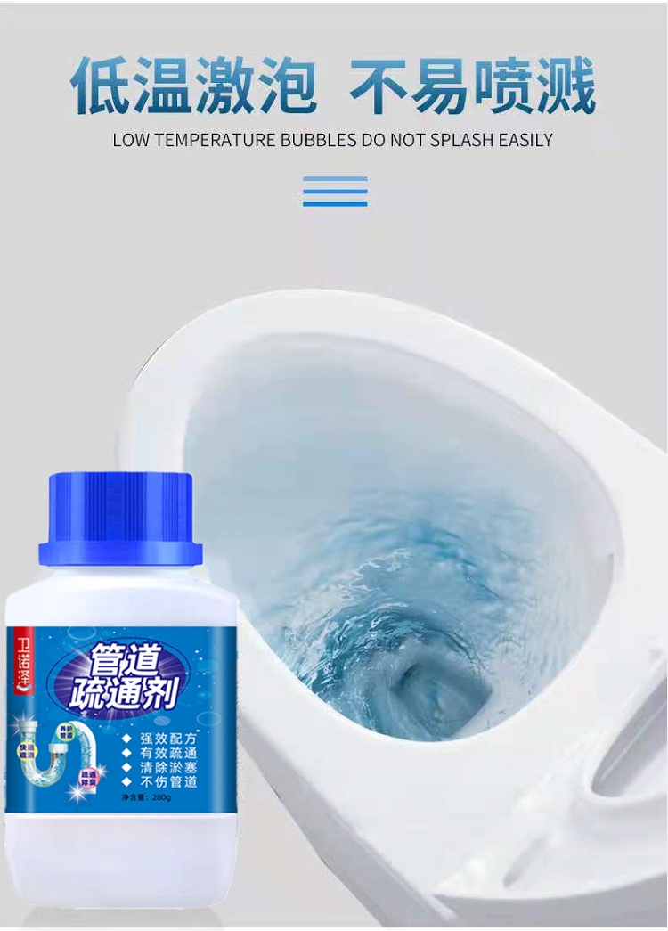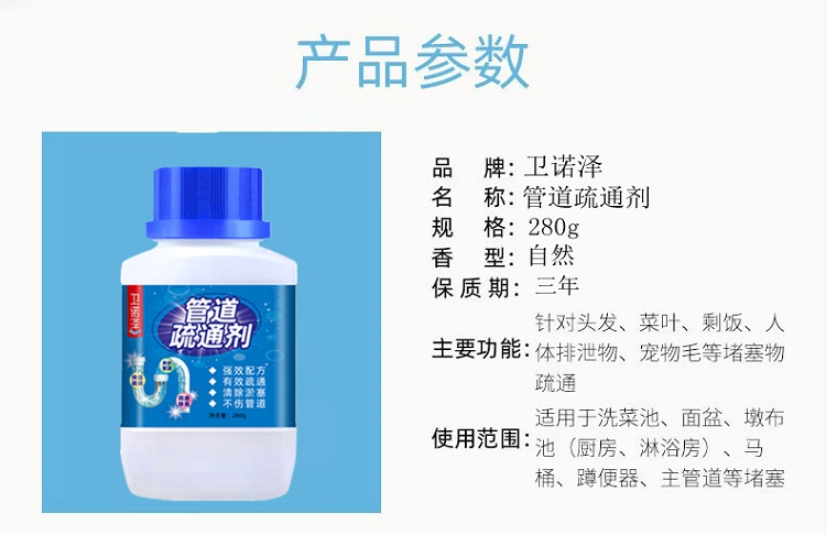 商品名称:卫诺泽下水道疏通剂280克/瓶管道疏通剂马桶厕所疏通厨房油污地漏管道堵塞溶解