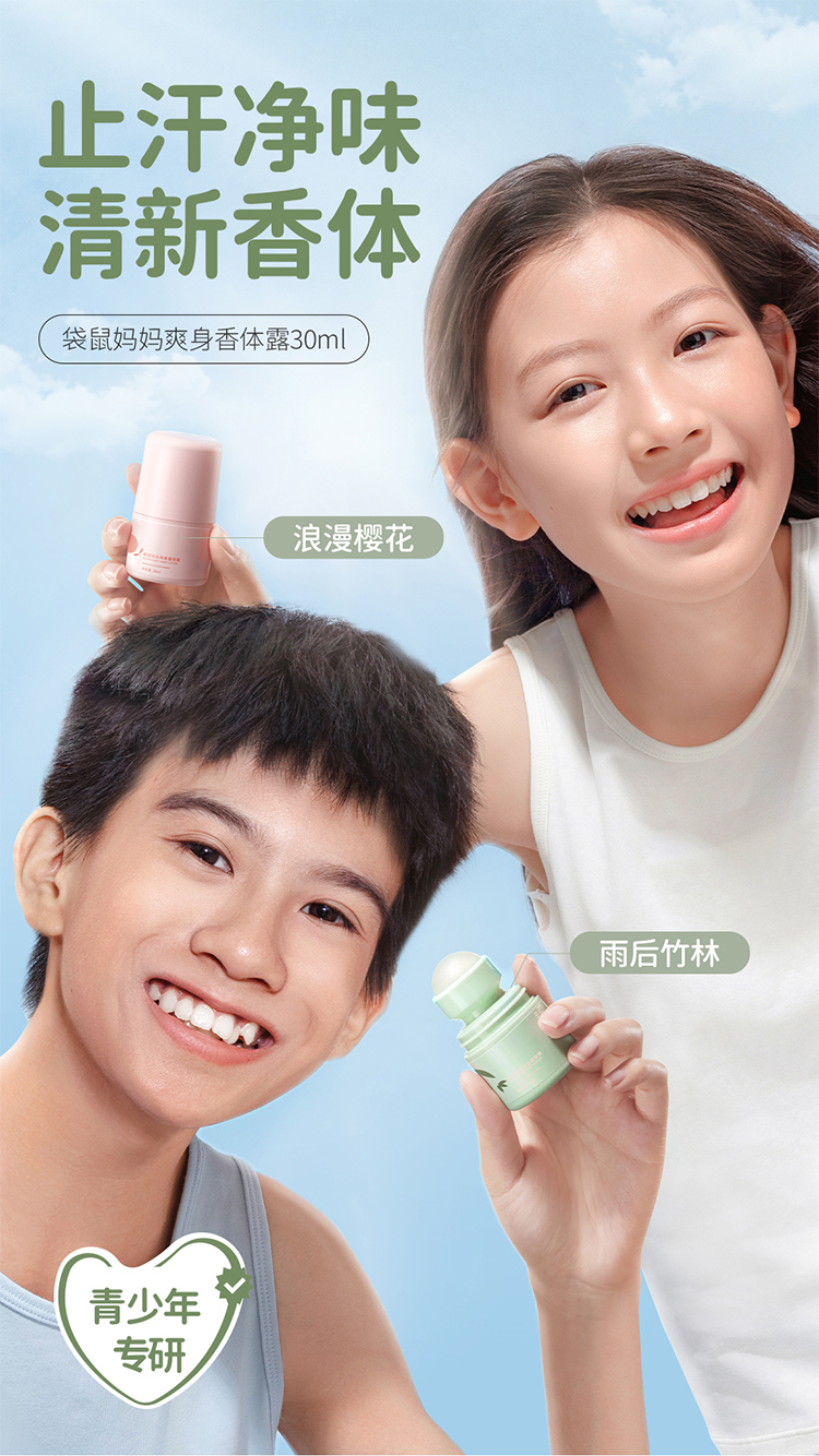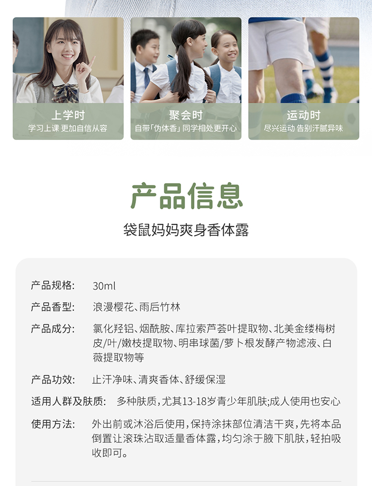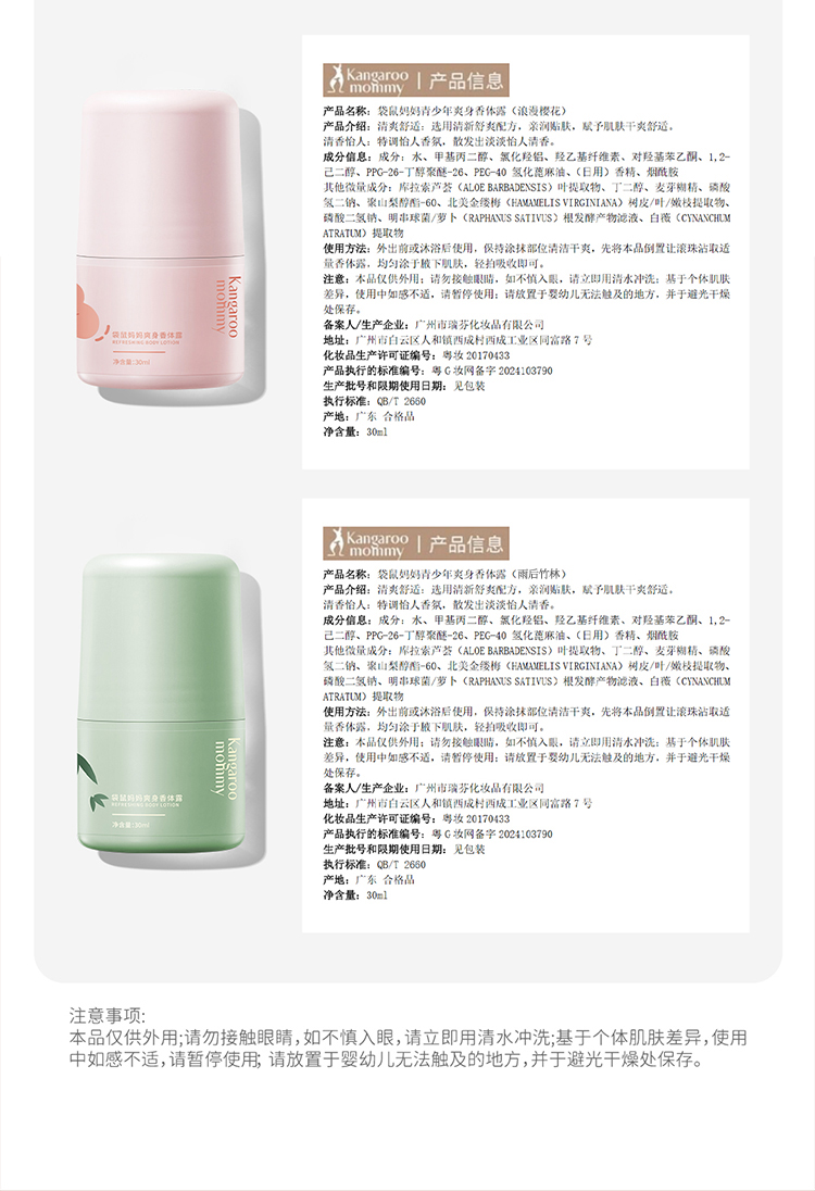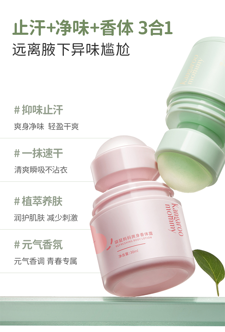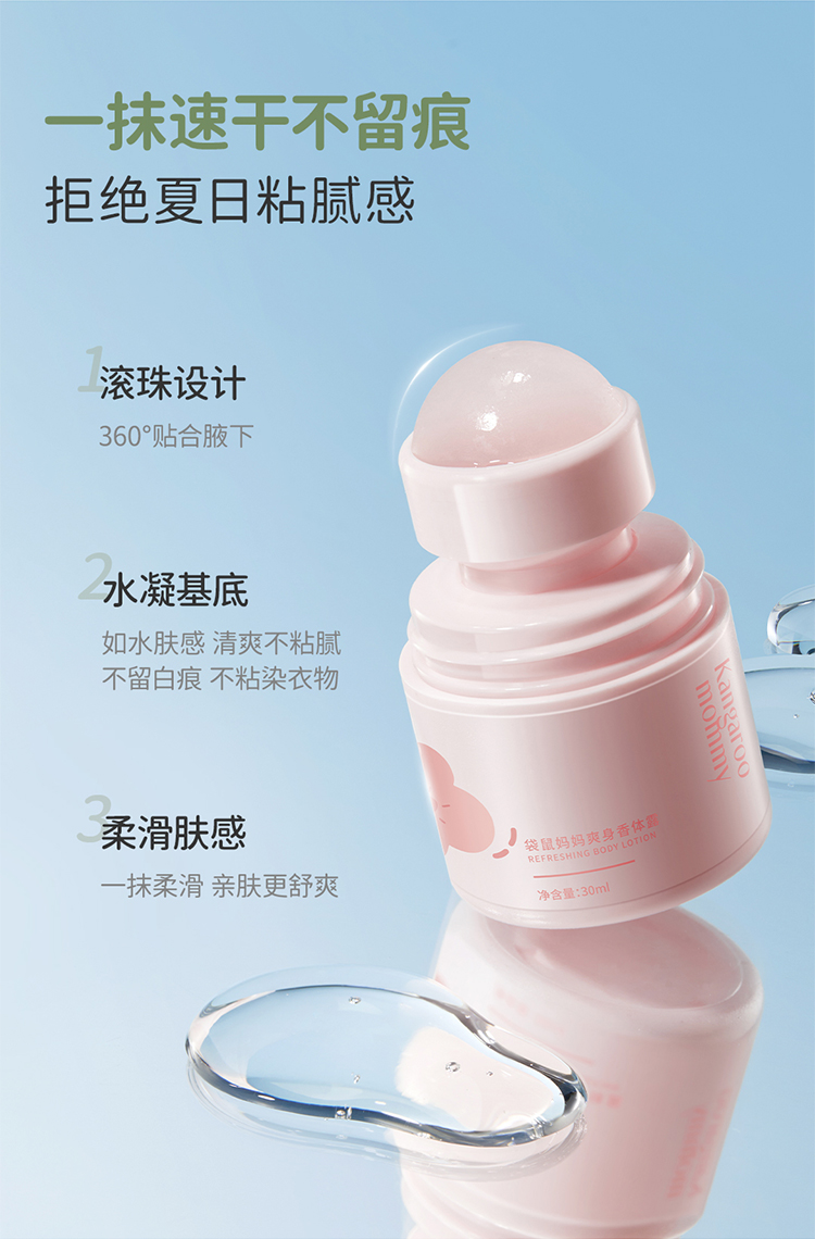 商品名称:袋鼠妈妈止汗露女腋下干爽持久萌宝留香体露除汗滚珠青少年儿童去异味走珠30ml