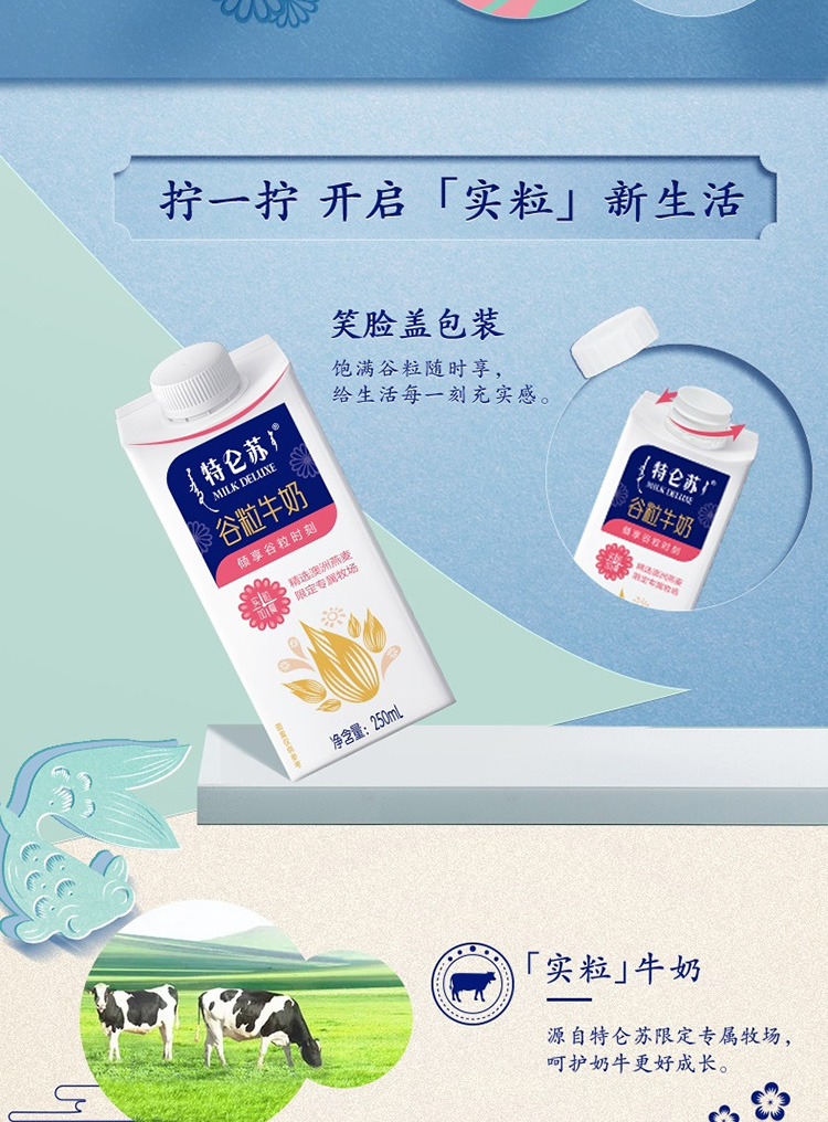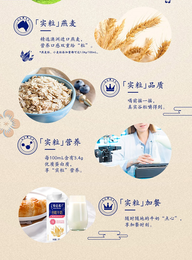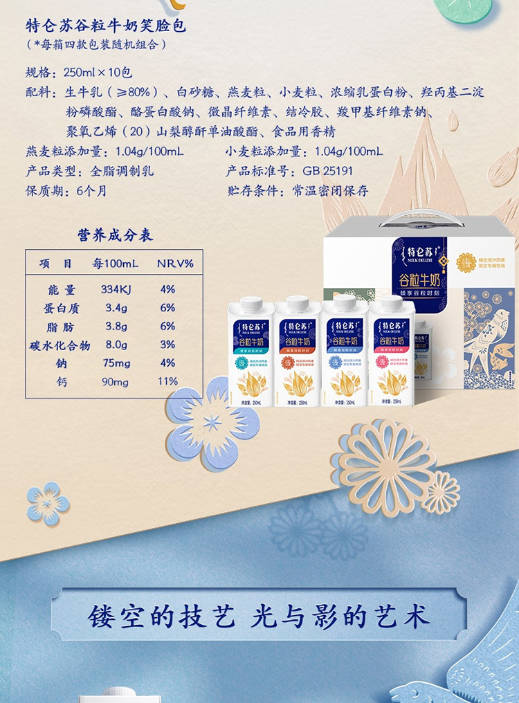 商品名称:蒙牛 特仑苏谷粒牛奶全脂调制乳康美笑脸包250ml×10包(礼盒装)燕麦营养优质早餐
