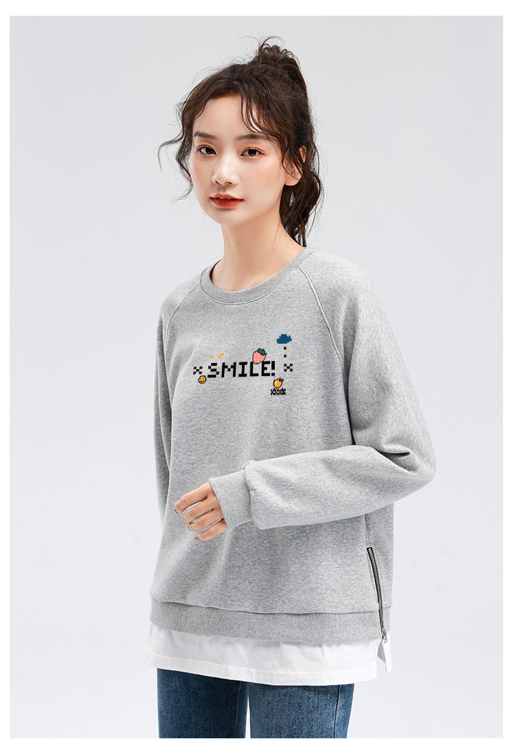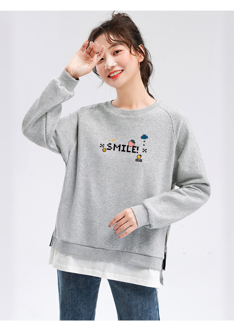 米子旗女式卫衣春秋款字母印花日系风格假两件侧边开叉外套上衣女 018330